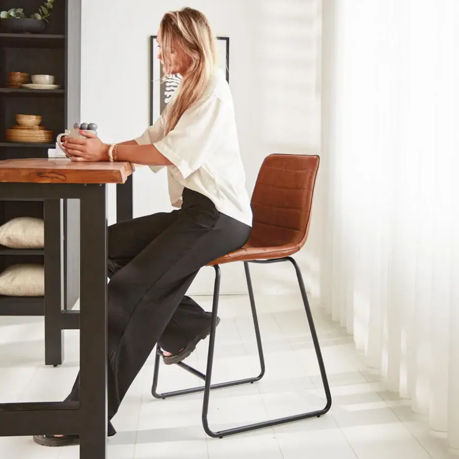 De zitting van de stoel is gemaakt van PU kunstleer. Dit is een materiaal dat voelt en eruit ziet als leer. Het materiaal is opgebouwd uit een laag textiel dat is afgewerkt met een kunststof toplaag. Op zoek naar een materiaal dat gemakkelijk is in onderhoud? Dan is een meubel van PU kunstleer precies wat je zoekt! PU kunstleer is gemakkelijk in onderhoud, sterk, vormvast, laat geen vocht door en diervriendelijk. Ideaal voor een interieur waar volop wordt geleefd en genoten!