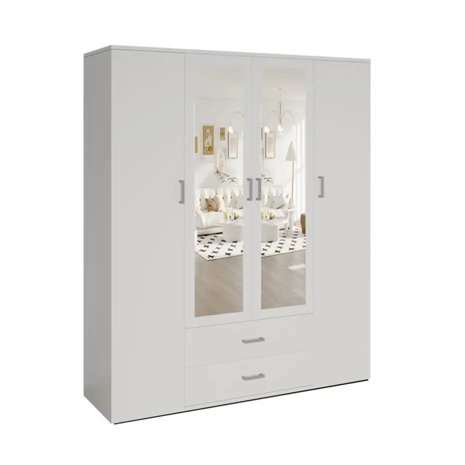 De Interiax Kledingkast ‘Lena’ in wit biedt een royale en stijlvolle opbergoplossing voor elke slaapkamer. Met afmetingen van 185x160x52 cm beschikt deze kast over uitgebreide opbergruimte, ideaal voor kleding, beddengoed en accessoires. De kast heeft 4 deuren, 2 lades voor kleinere items, 1 hanger voor het ophangen van kleding, en maar liefst 7 legplanken om alles overzichtelijk te organiseren. Daarnaast zijn er 2 ingebouwde spiegels op de deuren, wat de kast extra functioneel maakt en een ruimtelijk effect geeft. Het strakke witte design past perfect in diverse interieurstijlen, van modern tot klassiek.