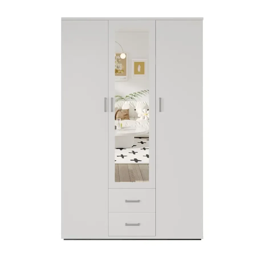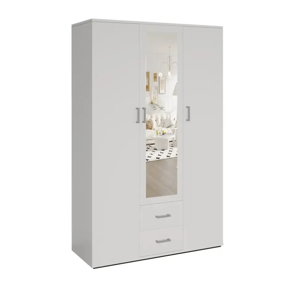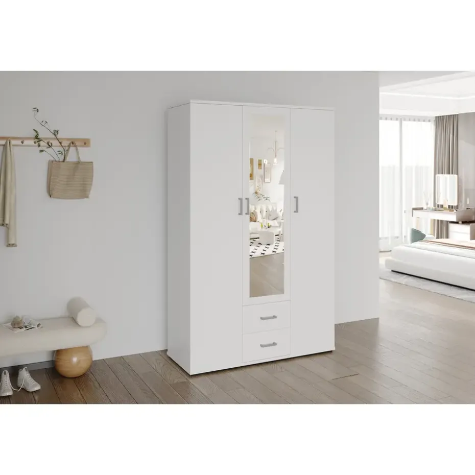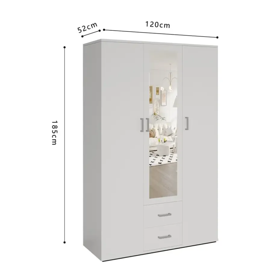 De Interiax Kledingkast ‘Lena’ in wit is een stijlvolle en functionele kast die royale opbergruimte biedt. Met afmetingen van 185x120x52 cm is deze kast perfect voor het overzichtelijk opbergen van kleding en accessoires. De kast beschikt over 3 deuren, 2 lades voor kleinere items, 1 hanger voor kleding, 4 legplanken voor gevouwen kleding, en een handige spiegel op de deur. Het strakke, witte design geeft de kast een frisse uitstraling die naadloos past bij diverse interieurstijlen, van modern tot klassiek.