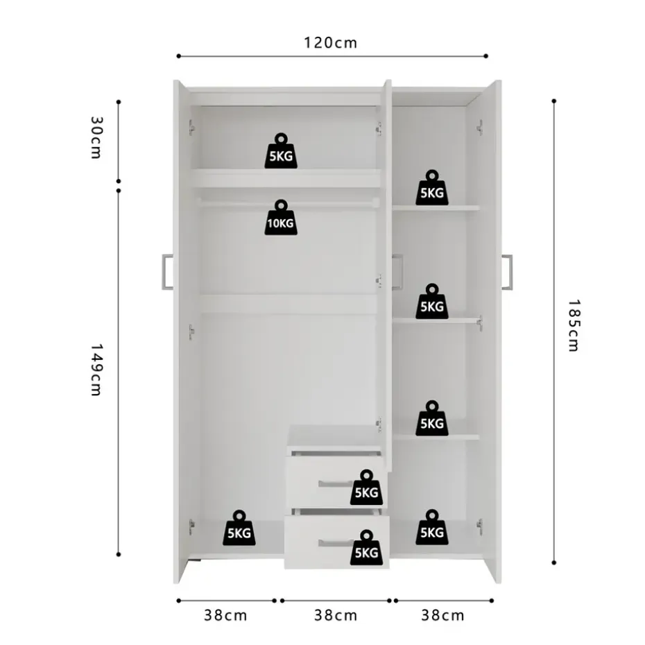 - Ruime en georganiseerde opbergruimte: 3 deuren, 2 lades, 1 hanger en 4 legplanken voor efficiënt opbergen.