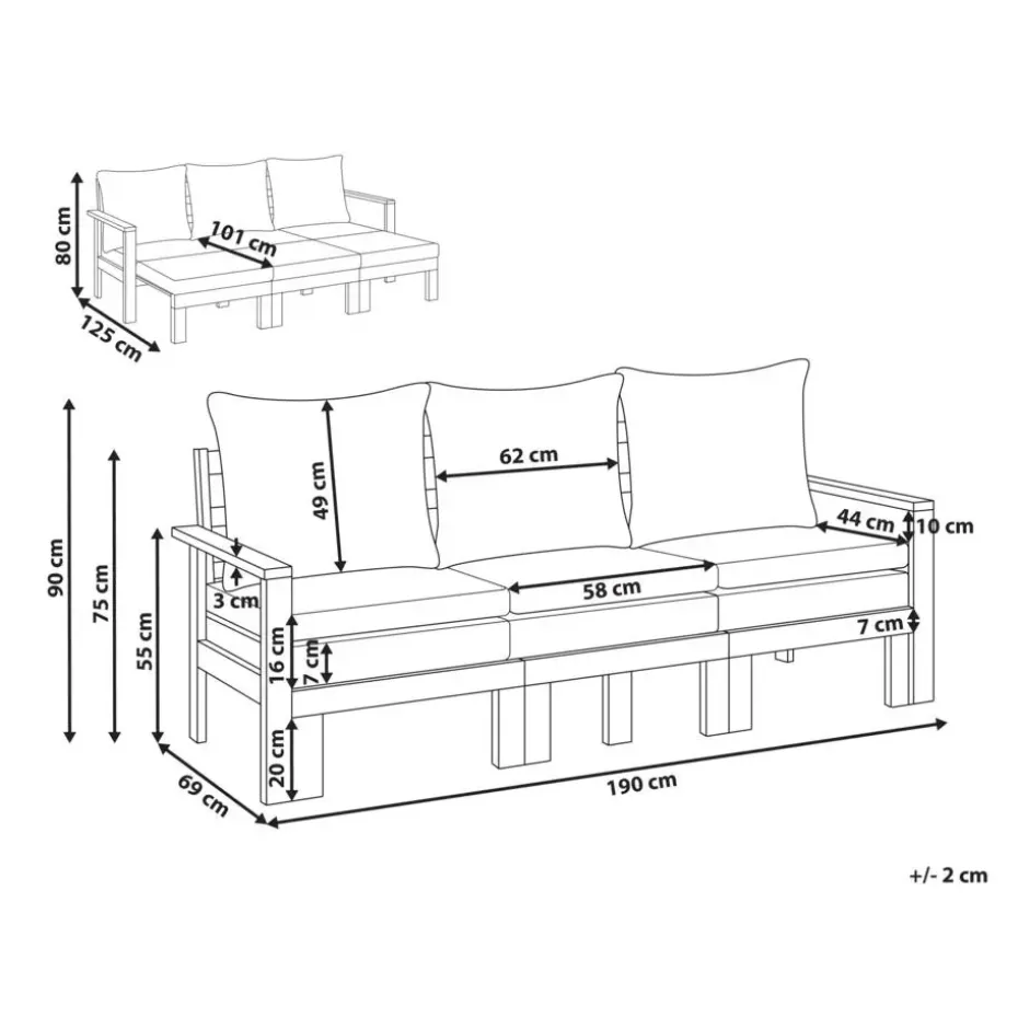 Belangrijkste eigenschappen: Brede, dik gestoffeerd zitvlak, Heerlijk zacht, Geschikt voor binnen- en buitengebruik, Om de kwaliteit te behouden, moet het beschermd worden tegen water en regen, Hoogwaardig materiaal, UV-bestendigheidsklasse 5 (ISO 105-B02), Verwijderbare kussenhoezen, Multifunctioneel