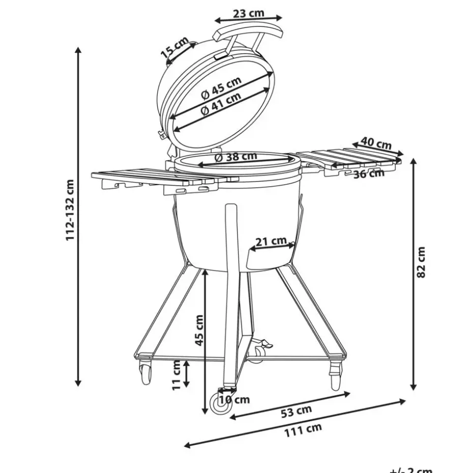 Belangrijkste eigenschappen: Met haakjes voor handdoeken en keukengerei, Thermometer voor het regelen van de kooktemperatuur, Verrijdbare poten voor het eenvoudig verplaatsen, Voor grillen, roken, bakken en braden in één toestel, Ontworpen om urenlang houtskool te branden met een constante warmte, Speciaal gemaakt voor gebruik buitenshuis, Hoge kwaliteit
