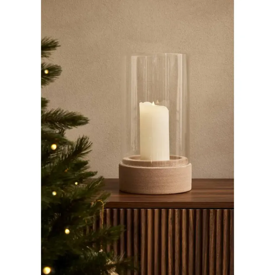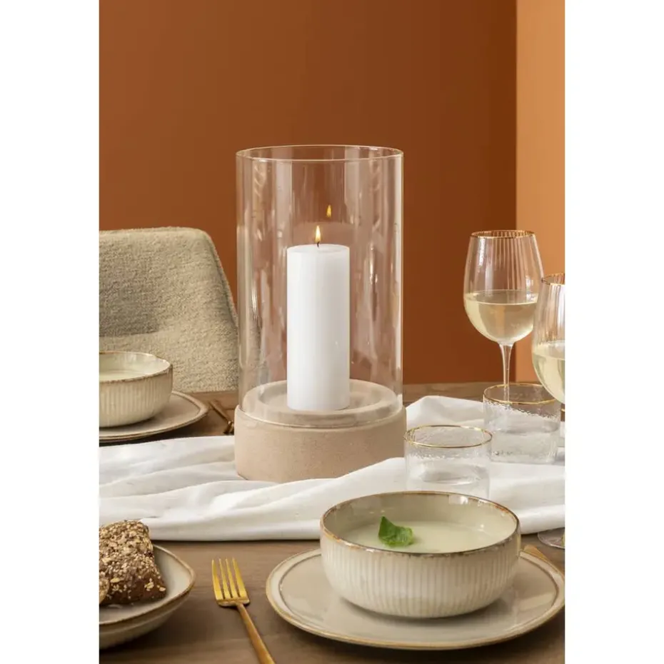Kandelaar Nora is gemaakt van keramiek en is beige van kleur. De kaarshouder is 35 cm hoog met een diameter van 19 cm. De houder is geschikt voor zowel stompkaarsen als waxinelichtjes.