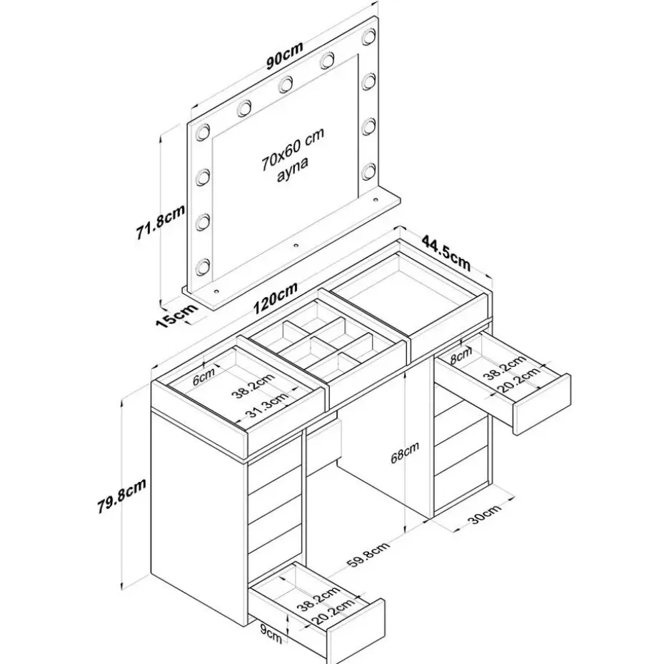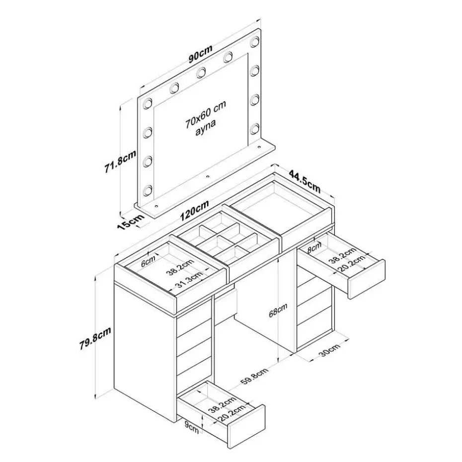 Met zijn ruime opbergruimte is onze make-up tafel een droom die uitkomt voor elke make-up liefhebber. Het ruime tafelblad biedt genoeg ruimte voor al je schoonheidsspullen, terwijl de drie lades je cosmetica netjes georganiseerd en gemakkelijk toegankelijk houden. De grote spiegel, met zijn perfecte afmetingen, zorgt ervoor dat je moeiteloos je make-up met precisie en vertrouwen kunt aanbrengen.