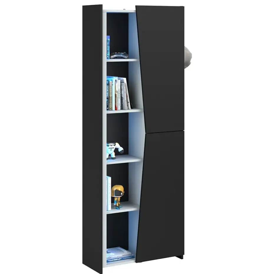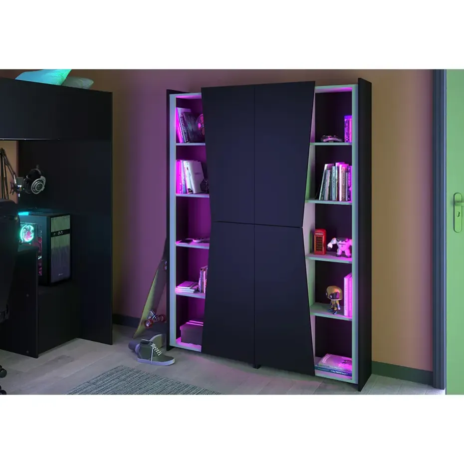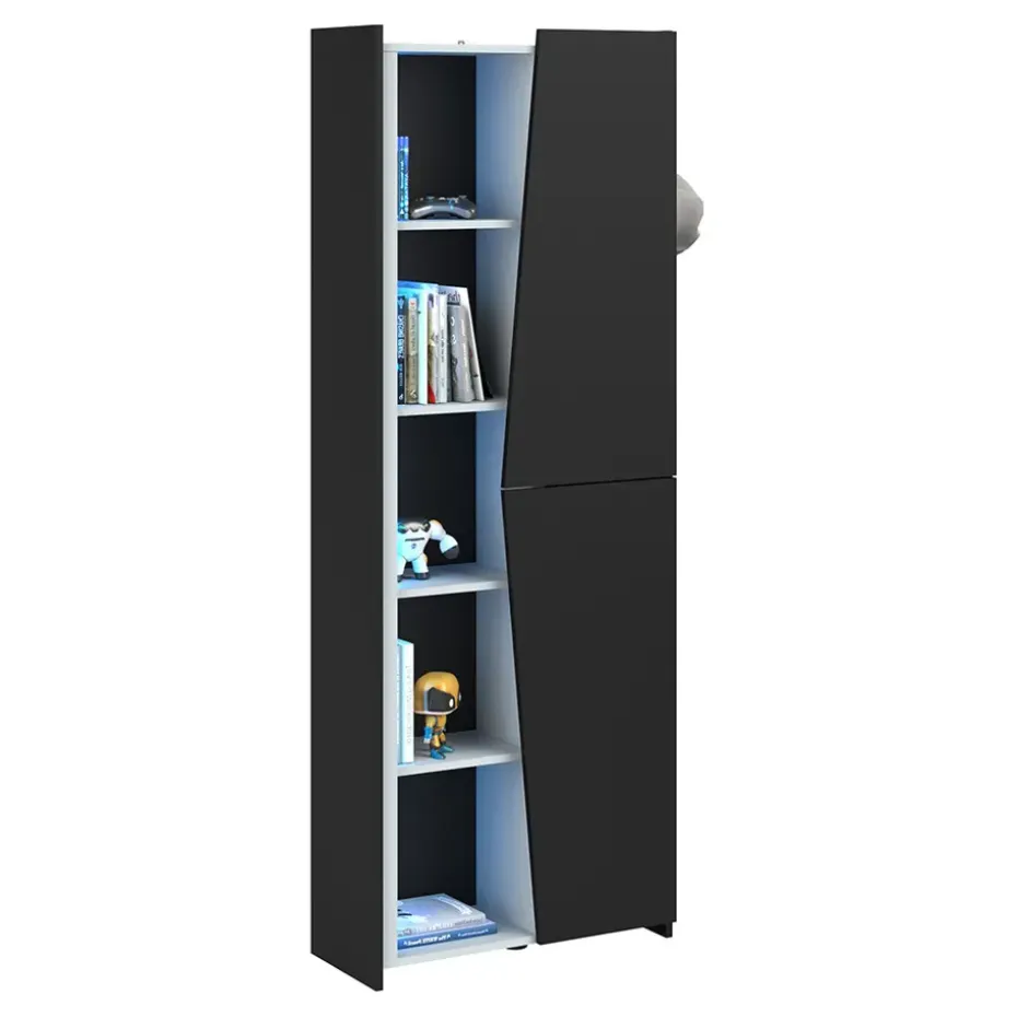 De kast heeft planken met led verlichting en bevat een open kant en een kant met een deur, wat de kast een extra stoere look geeft. Combineer deze kast met hoogslaper Levi voor een stoere game kamer!