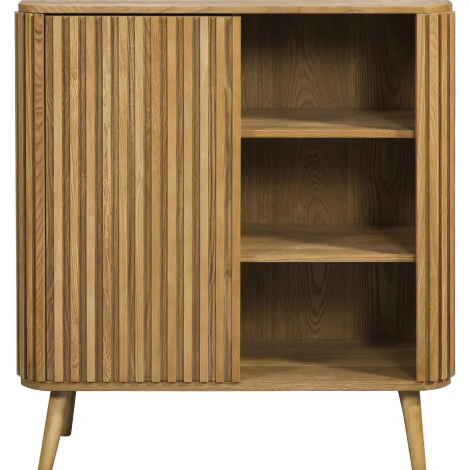 Kast Patrick is de perfecte kast om al jouw spullen in op te bergen en tegelijkertijd jouw interieur een luxe uitstraling te geven. De kast staat op houten pootjes en is gemaakt van hout met een naturelkleurige afwerking. De houten panelen met verticale lijnen geven een retro gevoel en een warme, natuurlijke uitstraling. De kast heeft een afmeting 100x90x40 (hxbxd) cm en heeft door de verschillende vakken voldoende ruimte om vanalles in op te bergen.