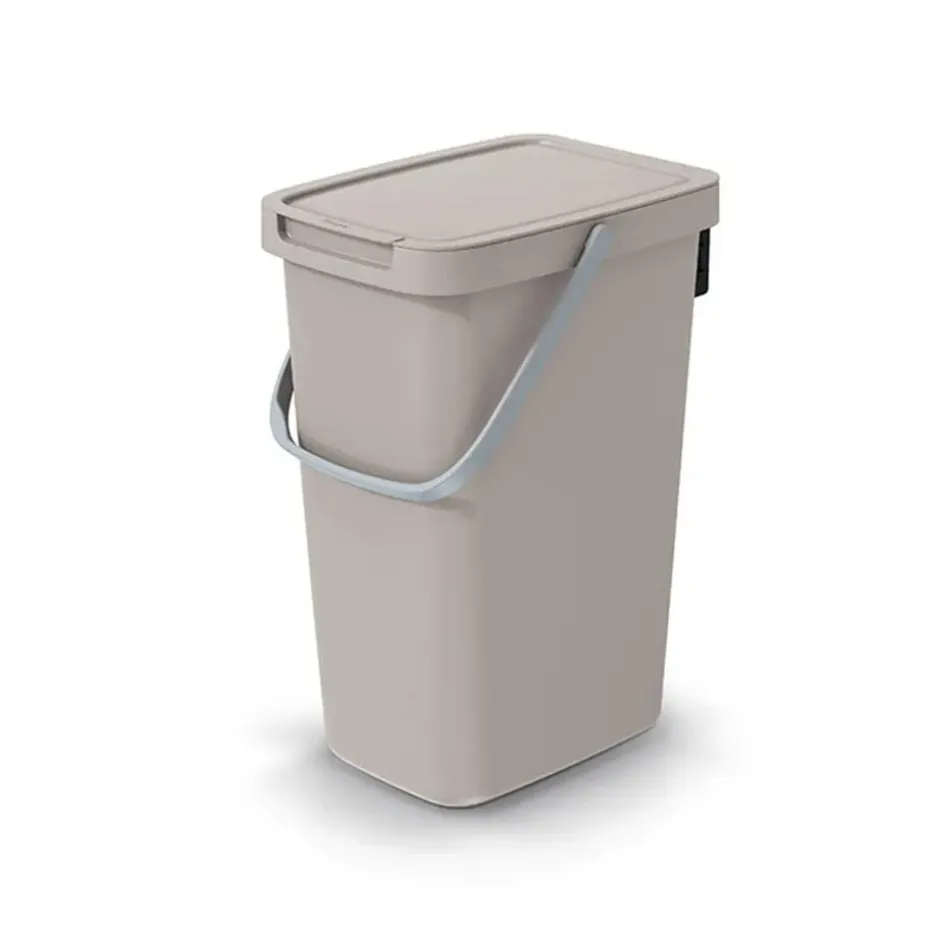 Sorteer of GFT afval scheiden prullenbak of afval emmer voor in de keuken of op/naast het aanrecht. Voorzien van afsluitbare deksel en hengsel. Ruim compartiment van 25 Liter. Kleur: beige. Afmetingen: 26 x 29 x 48 cm. Op te hangen met bijleverde beugel.