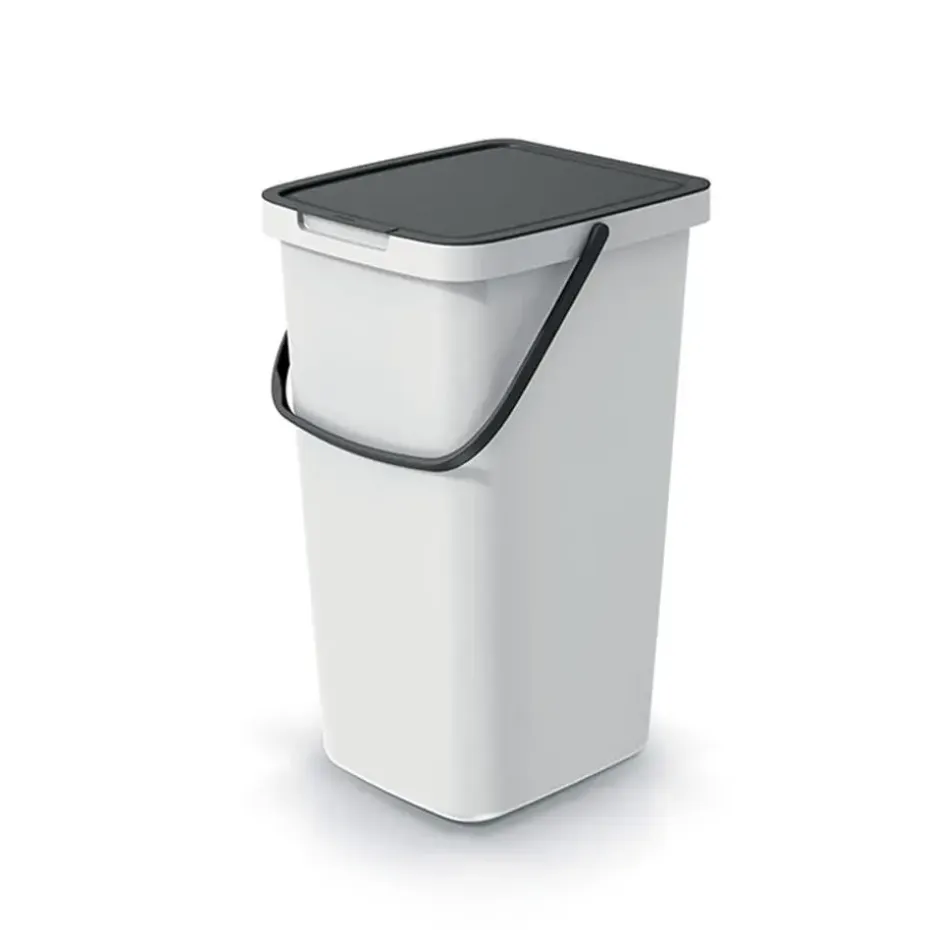Sorteer of GFT afval scheiden prullenbak of afval emmer voor in de keuken of op/naast het aanrecht. Voorzien van afsluitbare deksel en hengsel. Ruim compartiment van 25 Liter. Kleur: creme wit. Afmetingen: 26 x 29 x 48 cm. Op te hangen met bijleverde beugel.