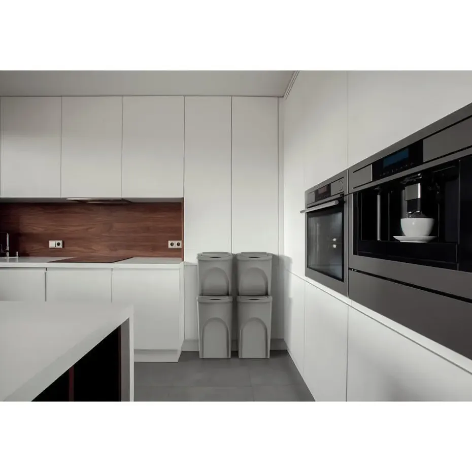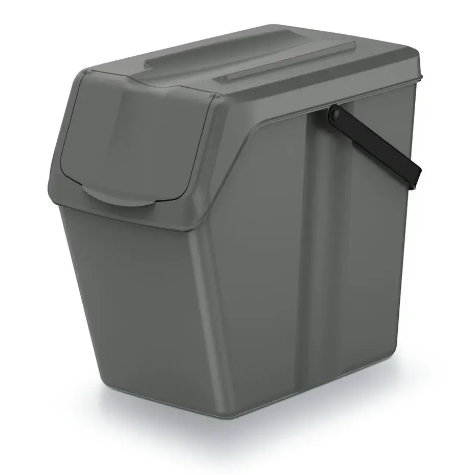 Sorteer of afval scheiden prullenbak of afval emmer. Voorzien van ingooi klepje, afsluitbare deksel en hengsel. Ruim compartiment van 25 Liter. Kleur: steengrijs. Afmetingen: 24 x 40 x 37 cm.
