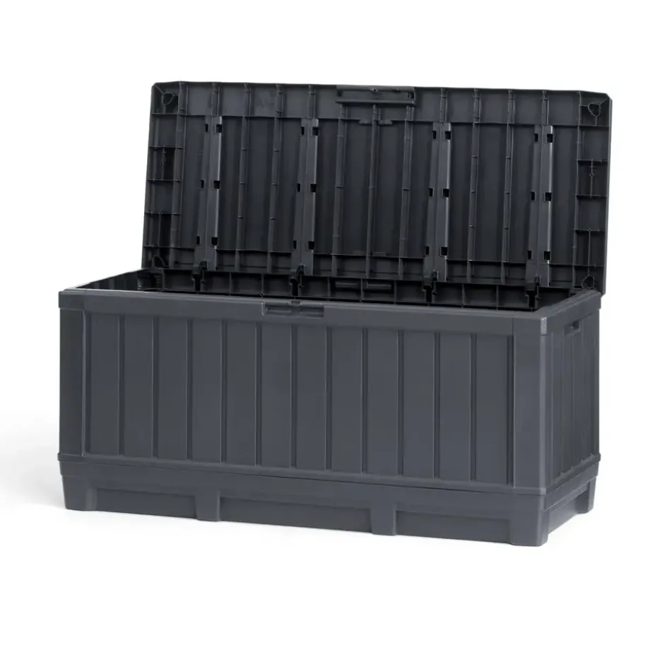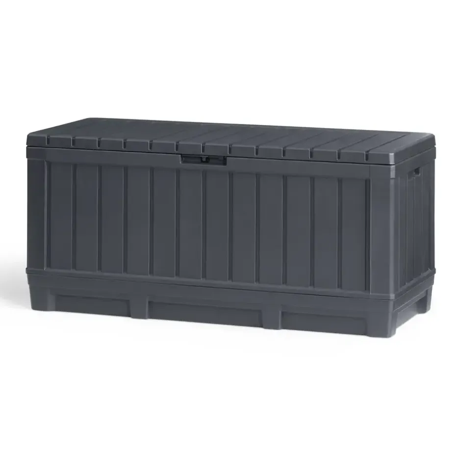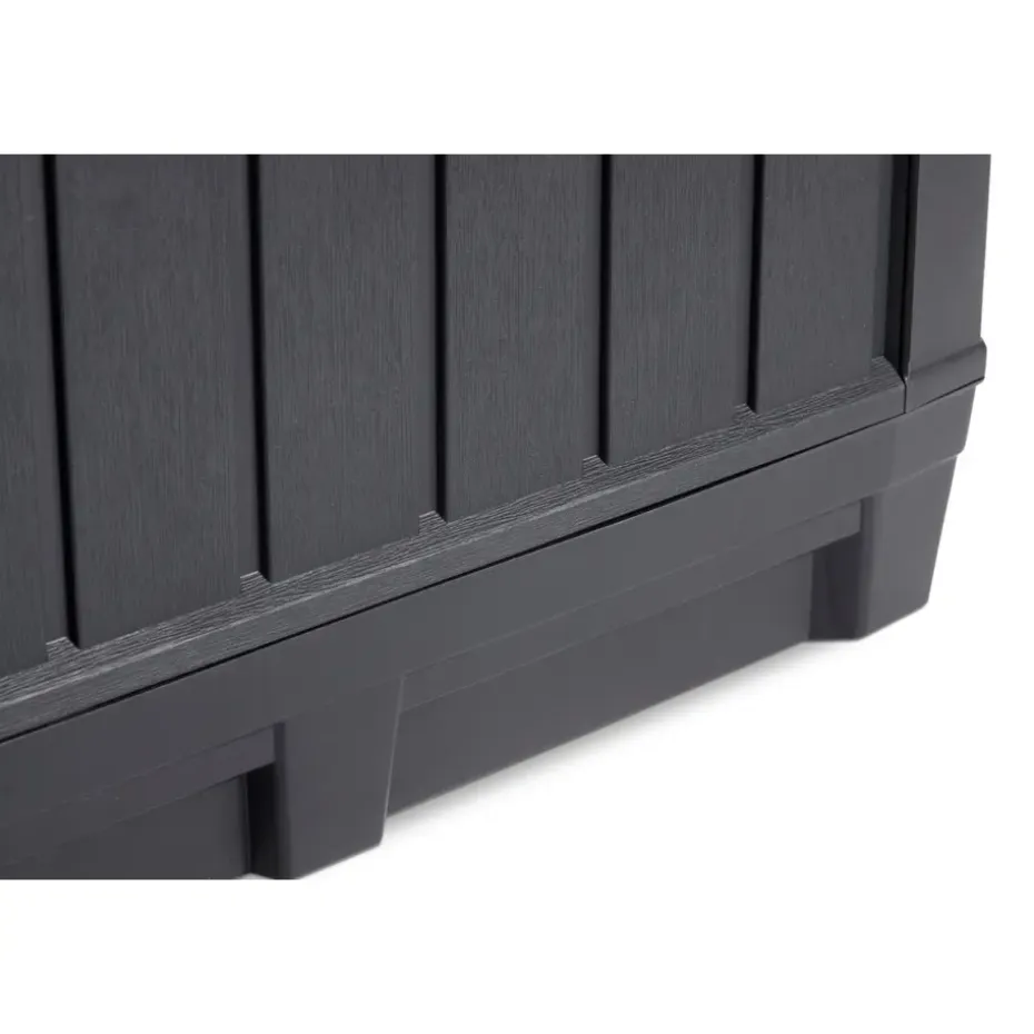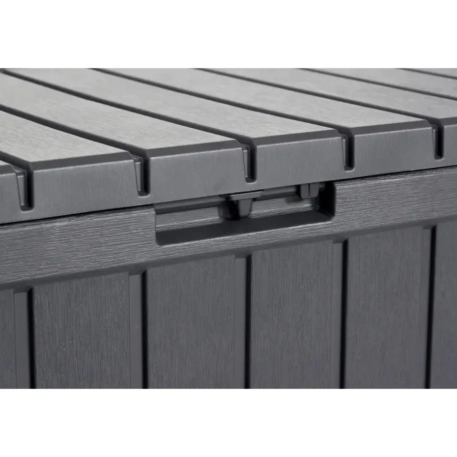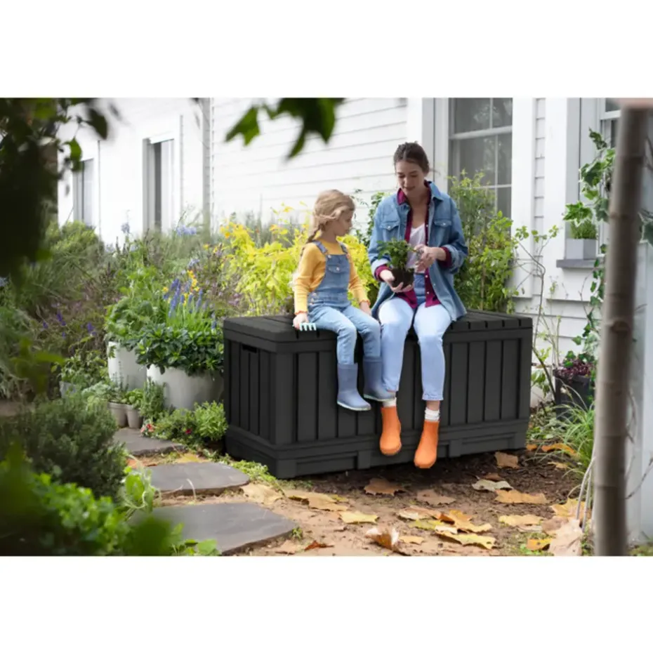 Berg je tuinspullen gemakkelijk en droog op in de ruime Keter Kentwood Opbergbox (350 liter). Met de stijlvolle houtlook is deze handige opbergbox een blikvanger in iedere tuin. De box is gemaakt van weerbestendig en duurzaam kunststof. Deze grote opbergbox houdt al je tuinspullen droog. Hij is stevig en biedt op het deksel een zitplaats voor twee volwassenen. Handig, zo bespaar je tenslotte ruimte in de tuin. De opbergbox is afsluitbaar met een hangslot (niet meegeleverd) en is grafiet van kleur.