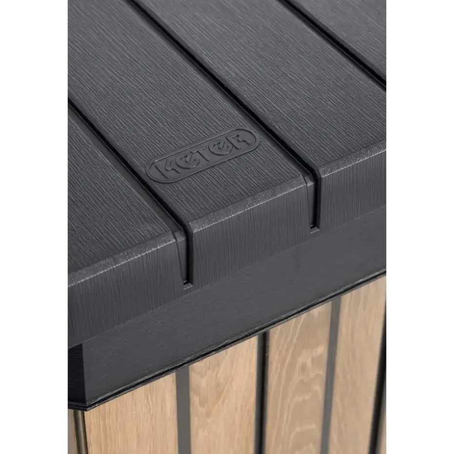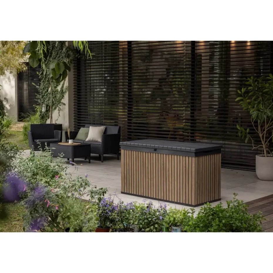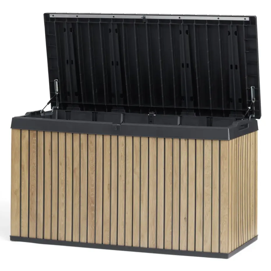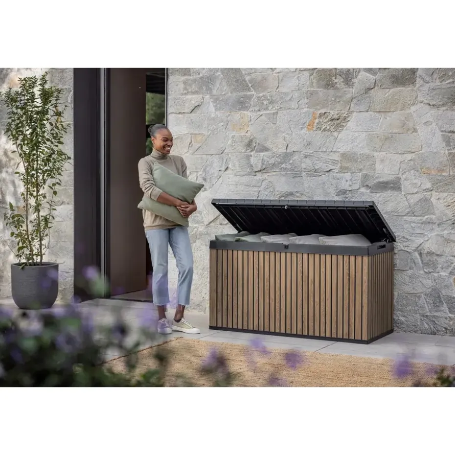 De Keter Venetian opbergbox 570L houdt je buitenruimte onberispelijk en opgeruimd. Deze rustieke kussenbox met houteffect is gemaakt met de nieuwste DECoCOAT UV-beschermde materialen. Deze is ontworpen om bestand te zijn tegen zon en regen en zal het hele jaar door alles. van kussens tot barbecue spullen. droog en geventileerd houden. De gasveren maken het openen van de tuinkussenbox heel eenvoudig. terwijl een afsluitbaar deksel je spullen beschermd houden. De Signature Collection is gemaakt van kunststof. maar heeft door de unieke materiaal- en printtechnologie de look en het gevoel van echt hout. tot aan de nerf toe. Maar in tegenstelling tot hout. zijn deze verbluffende afwerkingen gemaakt om een leven lang mee te gaan. Geen onderhoud. Geen verkleuring. Geen gedoe.