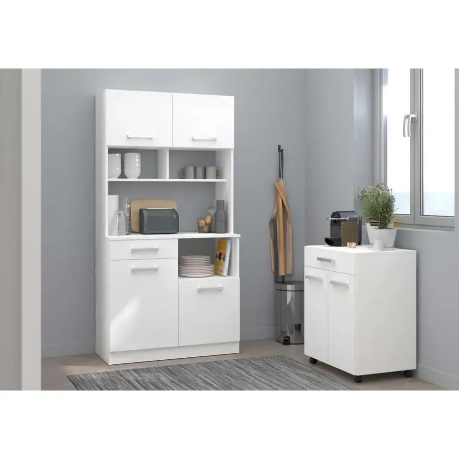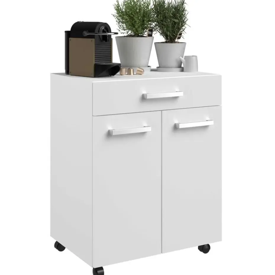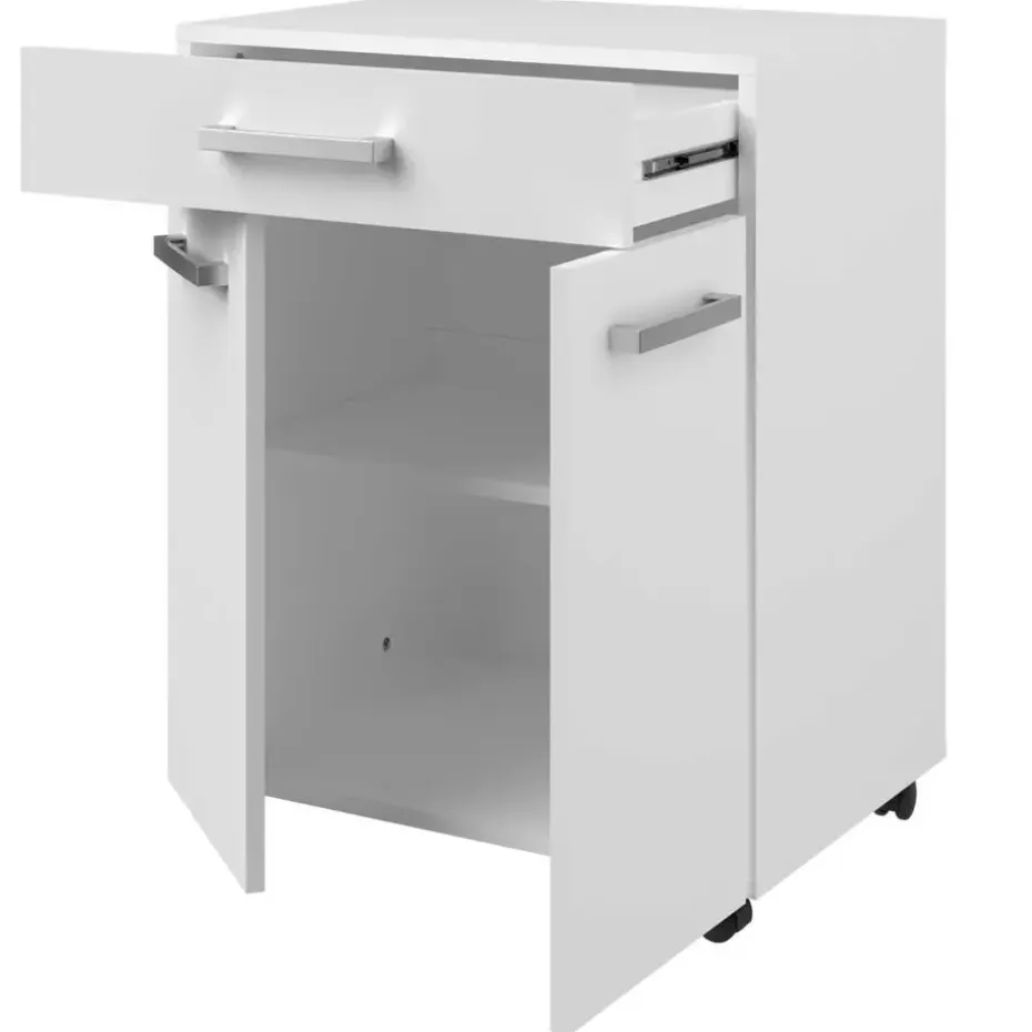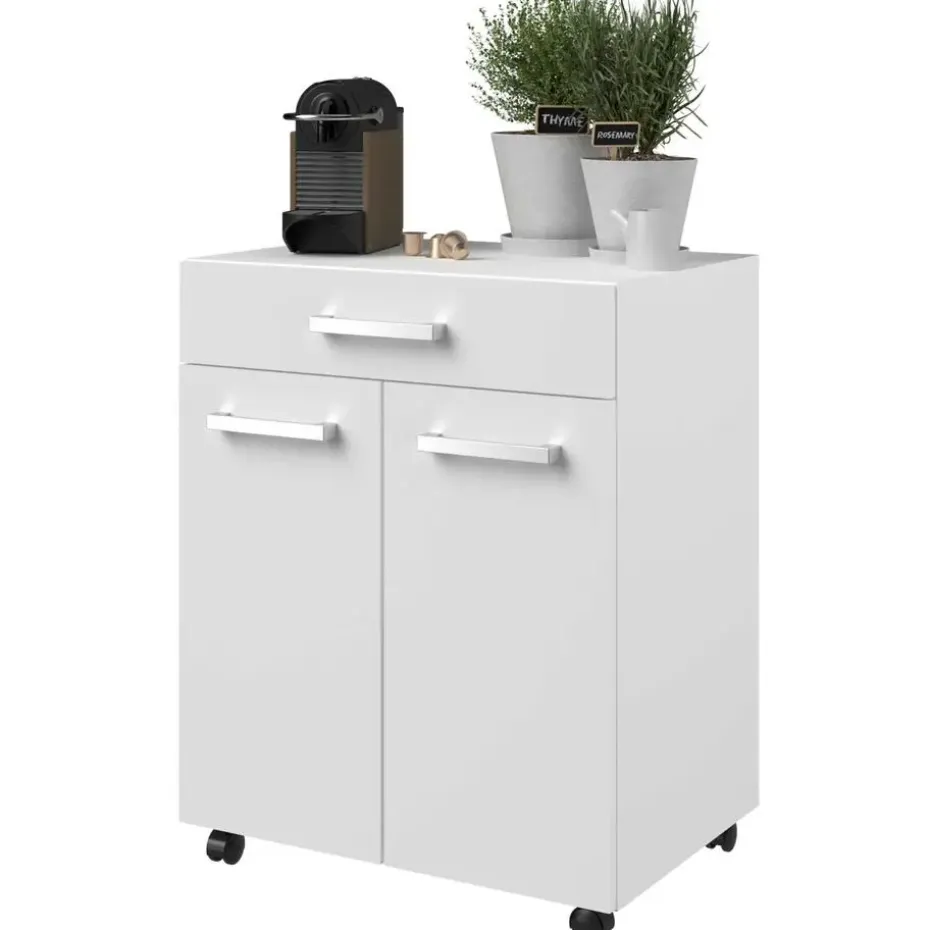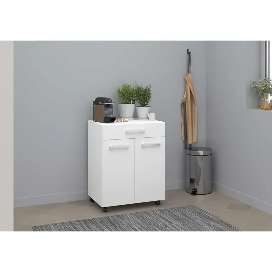 Met de tijdloze collectie Unya creëer je probleemloos meer opbergruimte in de berging, keuken of badkamer. De meubels zijn gemaakt uit spaanplaat met afwerking in melamine. Dit keukenkastje is uitgerust met twee deuren, waarachter je allerlei keukenspullen netjes en uit het zicht kan opbergen. In de opberglade heb je ook plaats voor allerlei kleine spullen en bestek. Dankzij de wieltjes kan je het kastje makkelijk verplaatsen waar je extra opberg- of werkruimte nodig hebt. Ontdek alle mogelijkheden die de reeks Unya biedt op onze website.