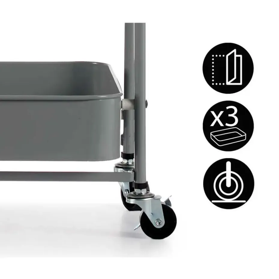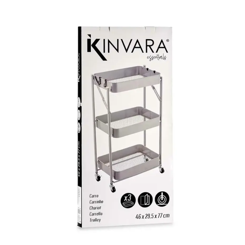 Kinvara Keuken/badkamer opberg trolley karretje. Afmetingen: L45 x B30 x H78 cm. Kleur: grijs. Materiaal: metaal. Deze trolley is makkelijk opvouwbaar zodat het miinder ruimte inneemt. Het karretje is voorzien van 4 wielen en heeft 3 lagen niveaus met rand. Gebruik de trolley in de keuken of badkamer om spullen op te bergen. Een must-have voor ieder huishouden.