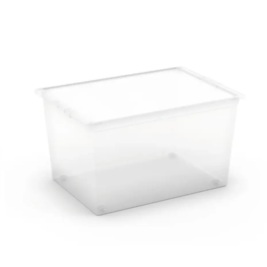 Grote, transparante, kunststof opbergbox met deksel en met praktische wieltjes. Wendbaar en verplaatsbaar, is deze opbergdoos onmisbaar voor het opbergen van kleding bij het wisselen van de seizoenen en het efficiënt organizeren van de klerenkast.