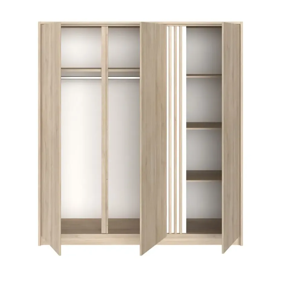 Kledingkast Evi heeft een ruime opbergcapaciteit en een uniek latjes design. De 3-deurs kast heeft zowel vouw- als ophangruimte en een afmeting van 203x185x52 cm (hxbxd). Deze eikenkleurige kledingkast past in vrijwel elk interieur. Combineer hem met bed en/of dressoir Evi voor een complete look!