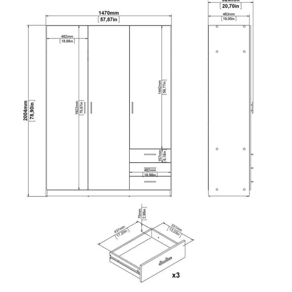 De 3-deurs kast heeft drie laden en een afmeting van 200x147x50 cm (hxbxd).