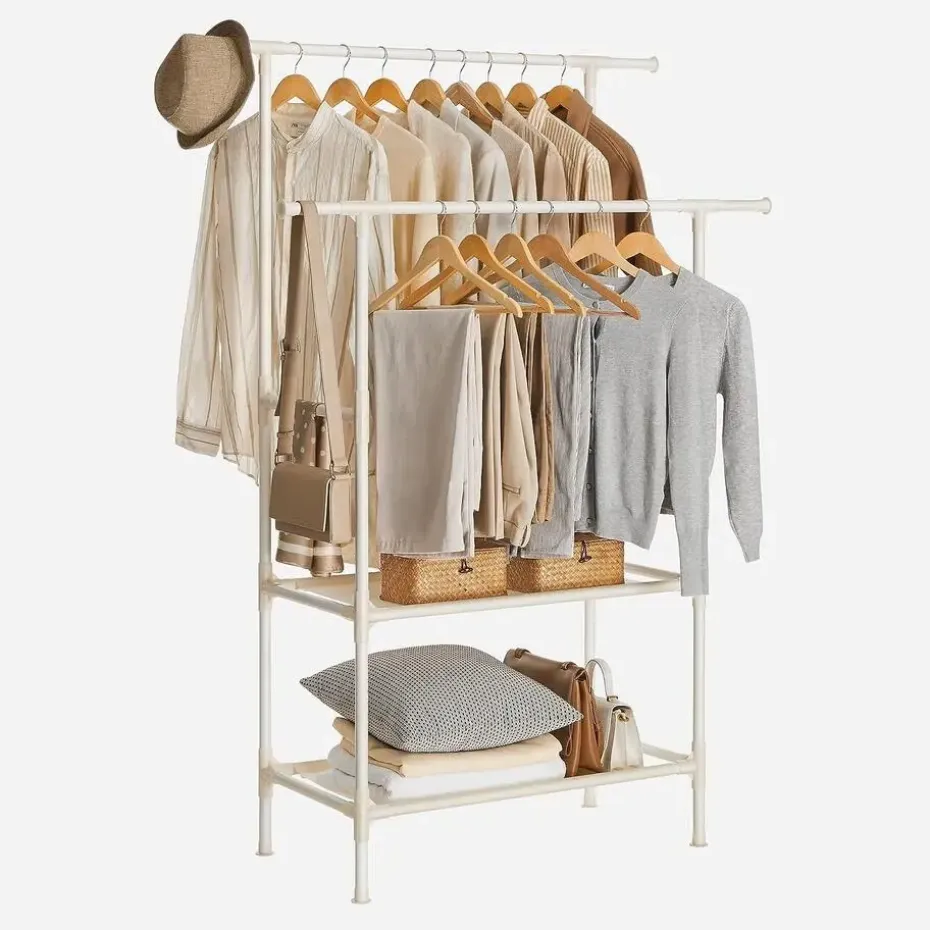 - kledingrek, kapstok van metaal, met 2 kledingstangen, 1 plank, tot 70 kg belastbaar, eenvoudige montage, wit, RDR01WT