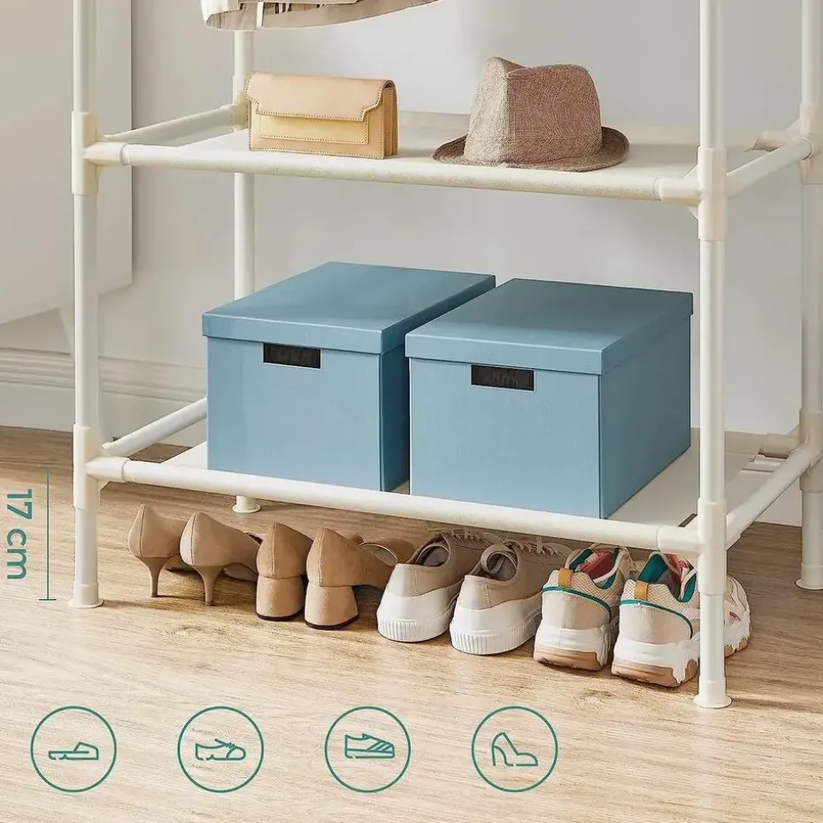 - Waar kun je dit kledingrek plaatsen? In de slaapkamer of kleedkamer om je kleding, schoenen en tassen op te bergen; in de hal om de jassen van je gasten op te hangen; op het balkon, om je wasgoed aan de lucht te laten drogen. Deze garderobe weegt slechts 2,8 kg en kan gemakkelijk overal naartoe worden vervoerd.