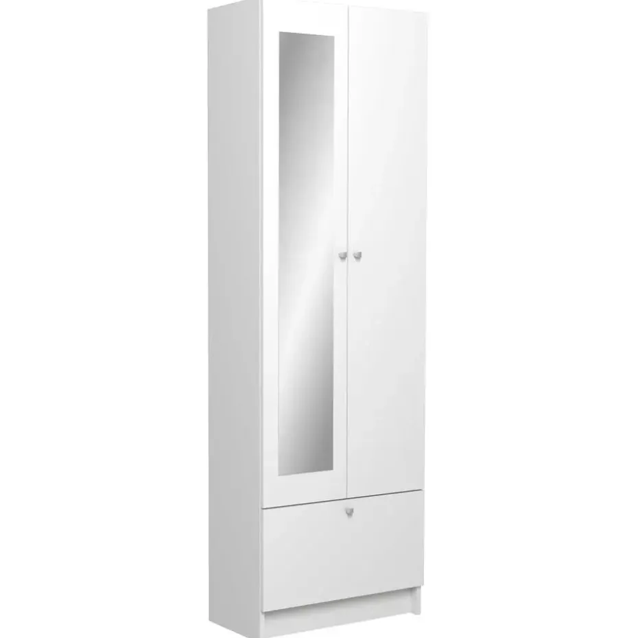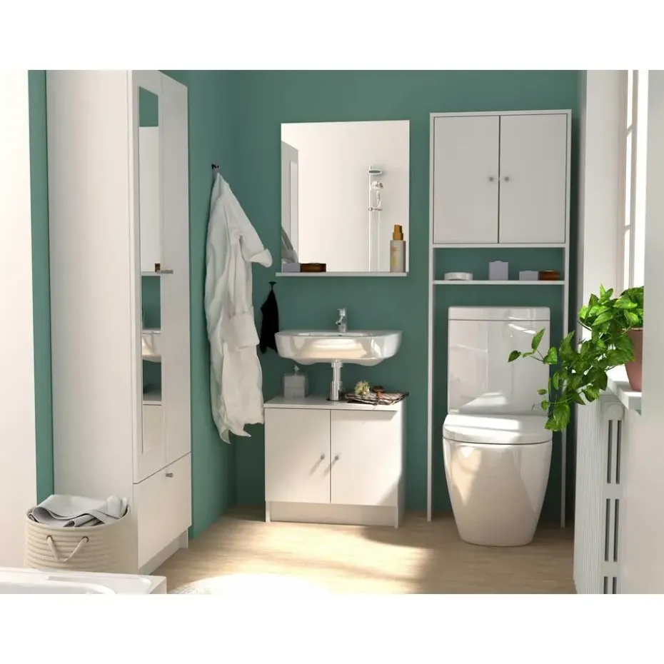 Ruimtebesparende Fares-badkamermeubelen in wit. Deze kolomkast met twee draaideuren en een grote lade is gemaakt uit gemelamineerde spaanplaat. Binnenin zijn tal van opbergmogelijkheden, voornamelijk door de drie ruime legplanken waarmee het meubel binnenin is uitgerust. De zachte witte, moderne kleur zorgt voor een rustgevende sfeer in je badkamer. In de Fares-uitvoering zijn nog een tweetal andere badkamerkasten opgenomen, die je eveneens op onze website kan aankopen.
