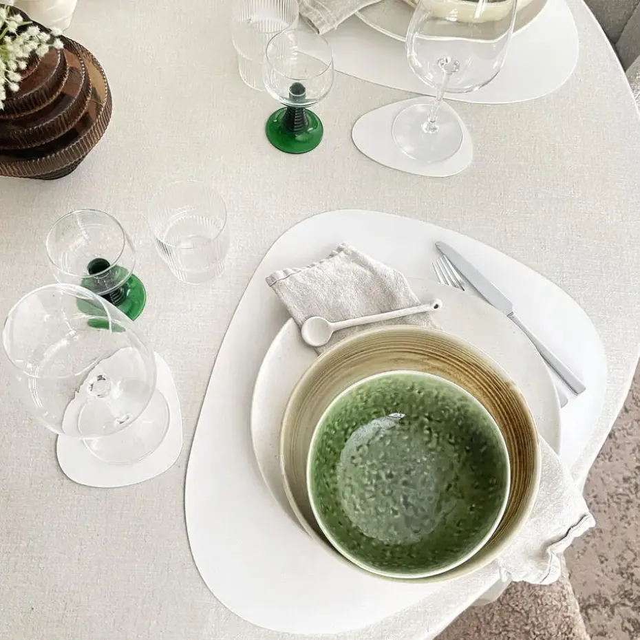 Door de designers van Krumble is heel veel aandacht besteed aan de vormgeving. Deze Krumble placemat en onderzetter set is druppelvormig en zijn daardoor eens wat anders dan de gewone rechthoekige exemplaren. En ze zijn heel praktisch op ronde tafels. Daar waar je met rechthoekige placemats zit te puzzelen en je je afvraagt hoe je ze precies moet leggen, passen deze druppelvormige tafelmatjes perfect op een ronde eettafel. De onderzetter voor het glas schik je dan zoals je het zelf wilt.