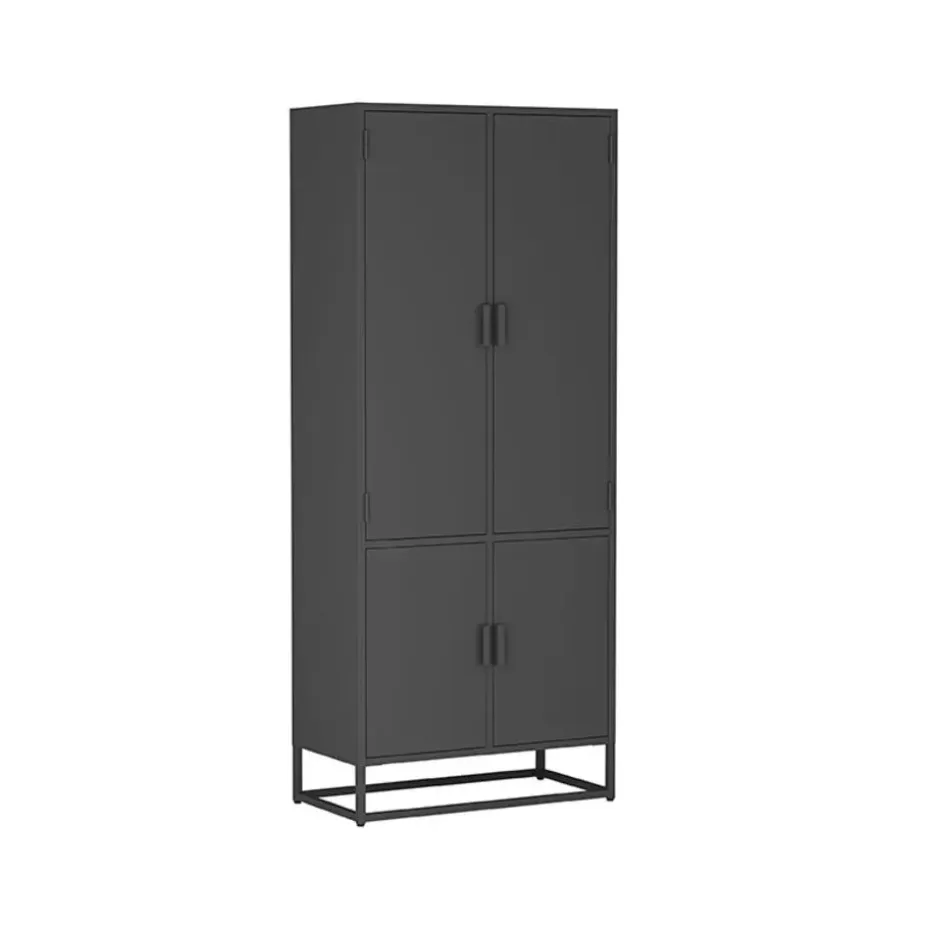 Hoge kast Luff, uitgevoerd in zwart metaal, is een kast voorzien van vier deuren. Alle deuren zijn in het bezit van een mooi, simplistisch vormgegeven handvat en worden gesloten middels stevige magneten. Achter deze deuren bevindt zich een royale ruimte die geheel naar eigen smaak, wens en doel is in te vullen met de meegeleverde benodigdheden. Zo worden er vier planken meegeleverd om een eigen kastindeling te maken. Dit zorgt ervoor dat deze kast een multifunctioneel item wordt en in vrijwel elke ruimte te gebruiken is.