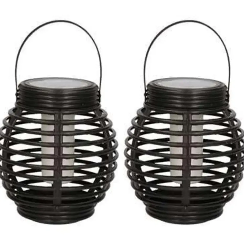 Set van 2 zwarte, ronde 12 led solar lantaarns met vlam effect 15 cm. Zwarte tuindecoratie lantaarns met vlameffect werkend op zonne-energie. Het formaat van deze tuinlantaarn is ca. 15 x 15 cm. Materiaal: kunststof. De brandduur hangt af van de weersomstandigheden, 8 uur volle zon zorgt voor een maximaal aantal branduren. U ontvangt in totaal 2 stuks.