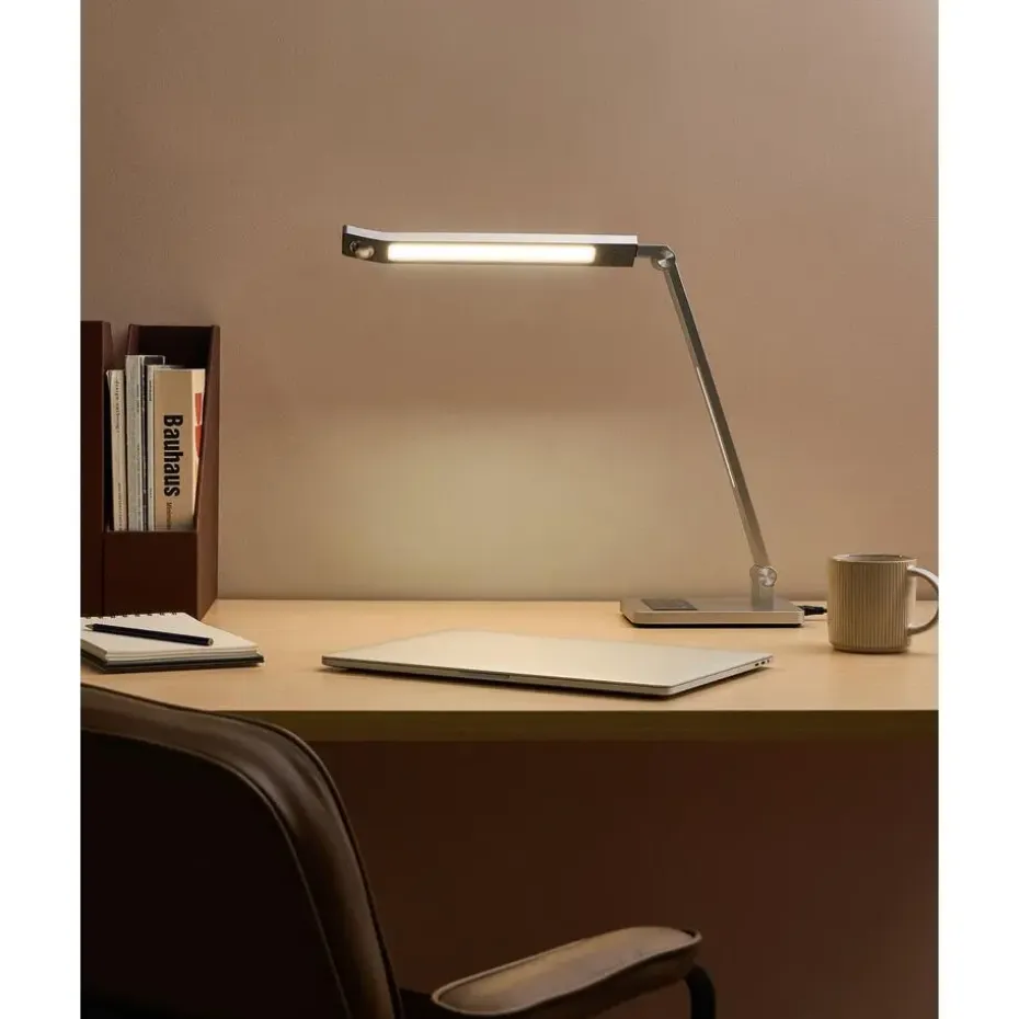 Belangrijkste eigenschappen: Dimmerfunctie om het lichtniveau aan te passen, Instelbare lichtintensiteit, Touch sensor-schakelaar, Verstelbare arm, Verstelbare kap, De bewegingssensor op de lamp gaat automatisch aan bij gedetecteerde beweging, Ingebouwde rustherinneringslampje met 3 keer knipperen om de 30 minuten, Verblindingsvrije zijpaneelverlichting voor oogcomfort en duidelijk zicht, Met 3 lichtstanden voor verschillende licht tempraturen
