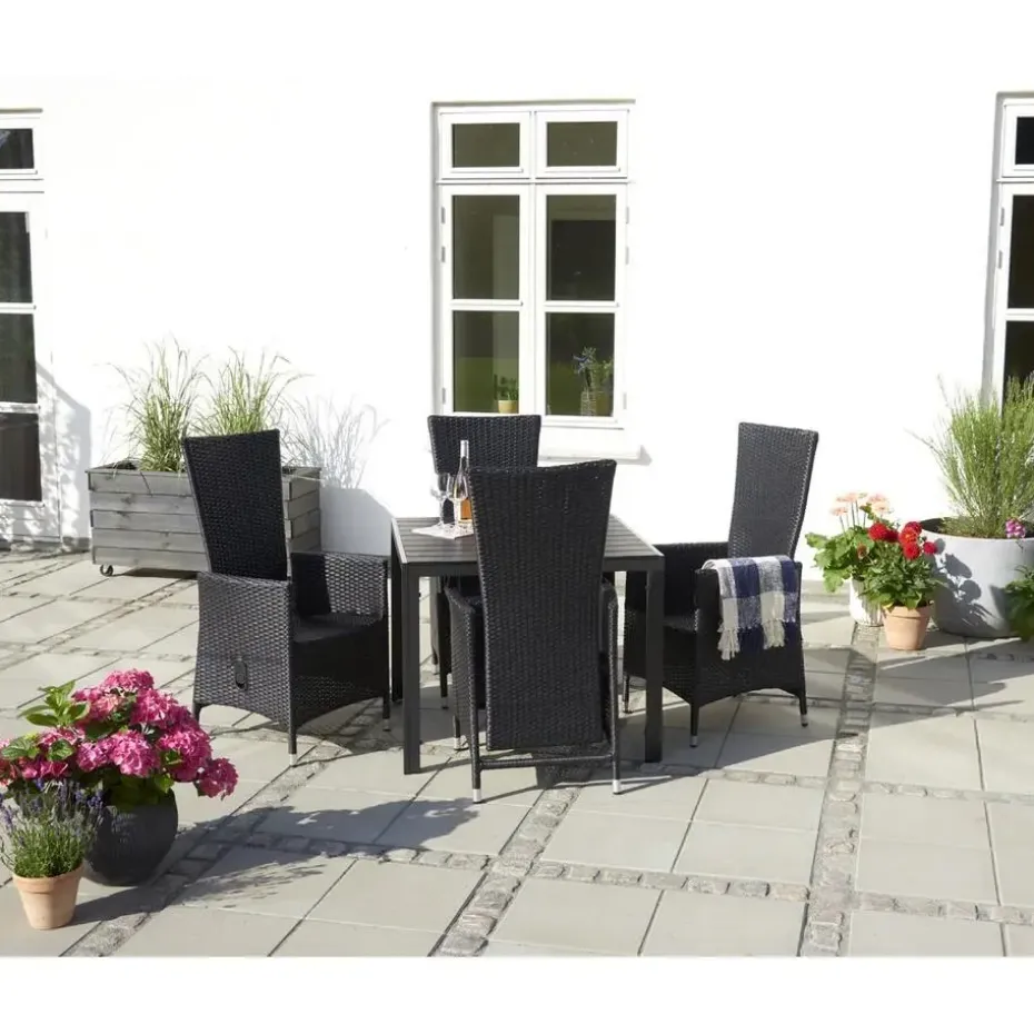 De tafel heeft een frame van aluminium en een tafelblad gemaakt van polywood. Polywood is sterk kunststof en ziet eruit als hout door de structuur van het blad. Let wel op: laat glazen niet te lang in de zon staan op een polywood tafel. Hierdoor kan een vergrootglaseffect optreden waardoor er smeltplekken ontstaan op het tafelblad. Ook hete voorwerpen zoals pannen kunnen niet direct op het tafelblad worden geplaatst. Heb jij een kleine tuin of alleen een balkon of terras? Dan is deze Vinn tuintafel met de compacte afmetingen perfect voor jou en kunnen er gerust nog 2 tot 4 personen rondom de tafel zitten. Je kunt de eettafel gerust buiten laten staan. Combineer deze tuintafel met één van onze tuinstoelen. Zie jij jezelf al ontspannen aan deze tafel?
