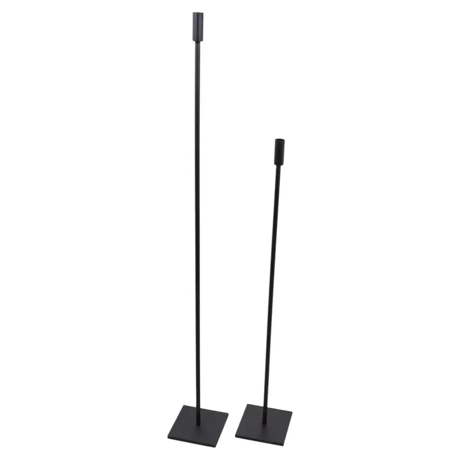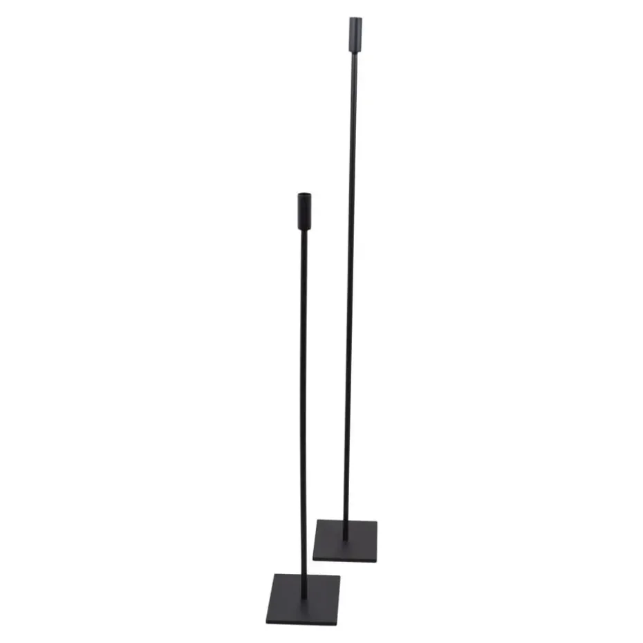 Set van 2 stoere metalen vloerkandelaren met dinerkaarshouder. De kandelaren hebben 2 verschillende hoogtes, de kleine is 90cm. en de grote 120cm. De vloerplaat is van massief metaal waardoor deze stevig staat.