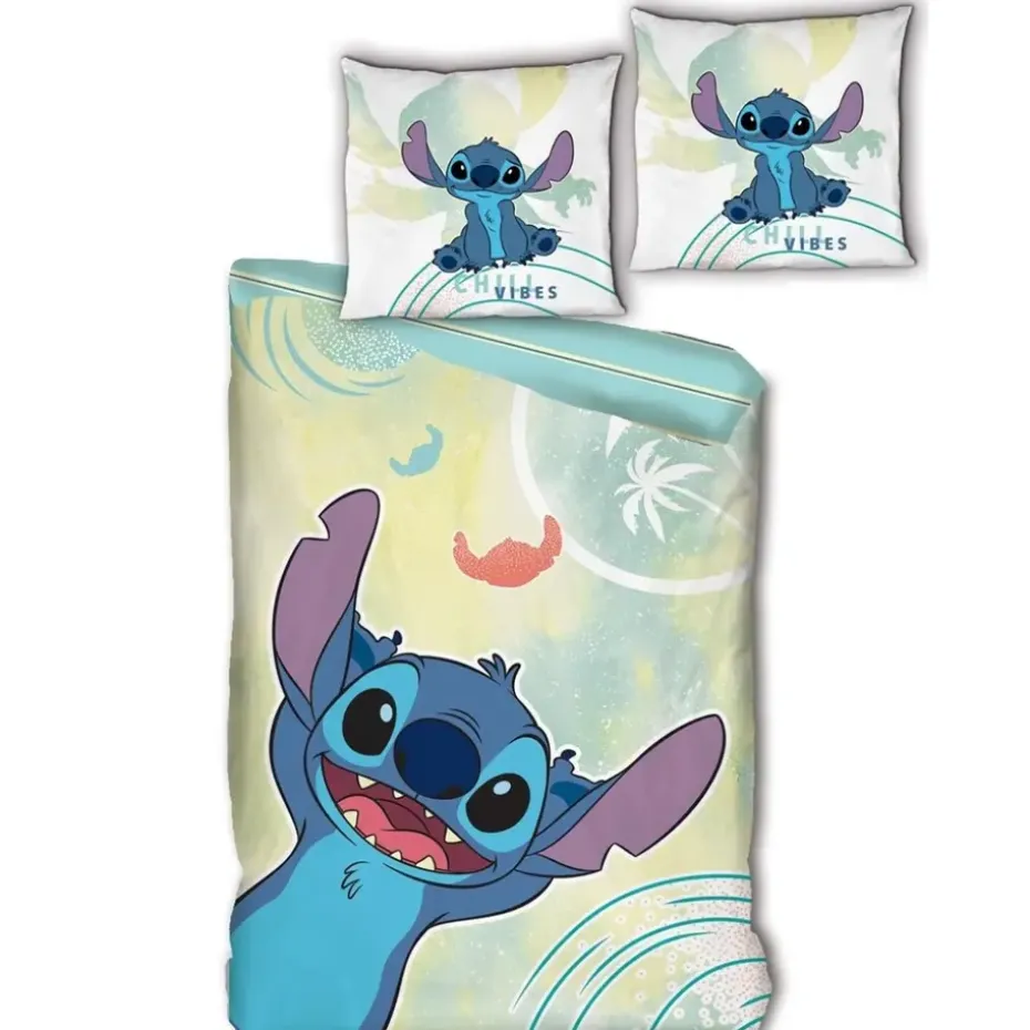 Lilo & Stitch dekbedovertrek, Chill Vibes. Een lief dekbedovertrek van de kleine alien Stitch. Deze ondeugd is een hit door de populaire films Lilo & Stitch. Stitch heeft een prominente plek gekregen op dit mooie dekbedovertrek en kussensloop. Het overtrek is dubbelzijdig bedrukt, waardoor deze reversible is. Een geweldig cadeau voor de liefhebbers van deze kleine vreemdeling en een leuk kado suggestie voor een verjaardag of de feestdagen.