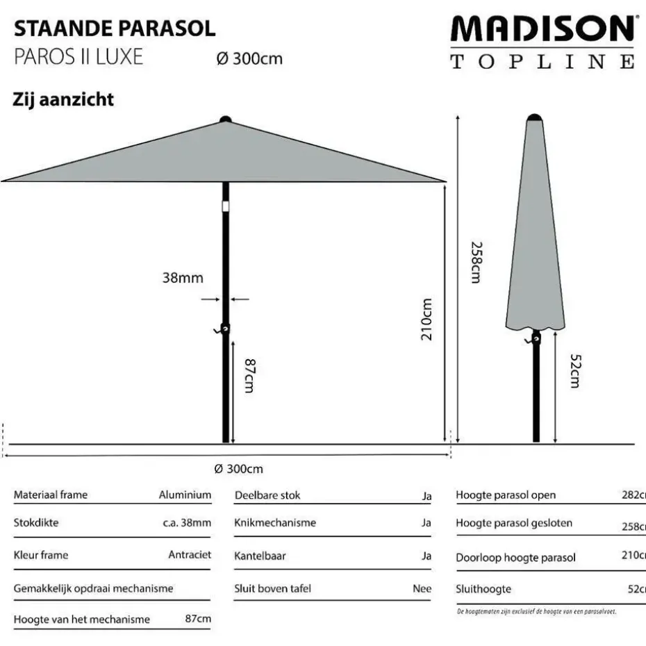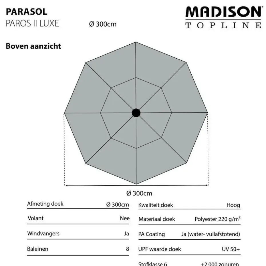 Deze prachtige Madison Parasol Paros II Round Safier Blue is een echte eyecatcher voor in iedere tuin. Naast dat de parasol voor bescherming biedt voor regen en zonnestralen, zorgt het trendy design ook nog is voor een stijlvolle toevoeging aan uw tuin of balkon. De Madison Parasol Paros II Round Safier Blueis gemaakt van kwalitatief sterk 100% Polyester en is weersbestendig. De producten van Madison worden voornamelijk geproduceerd in Nederland en worden gemaakt van enkel hoogwaardige materialen. Heeft u vragen over de parasol? Neem dan contact met ons op. Wij helpen u graag verder.