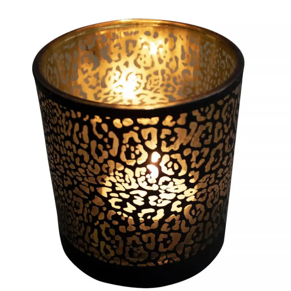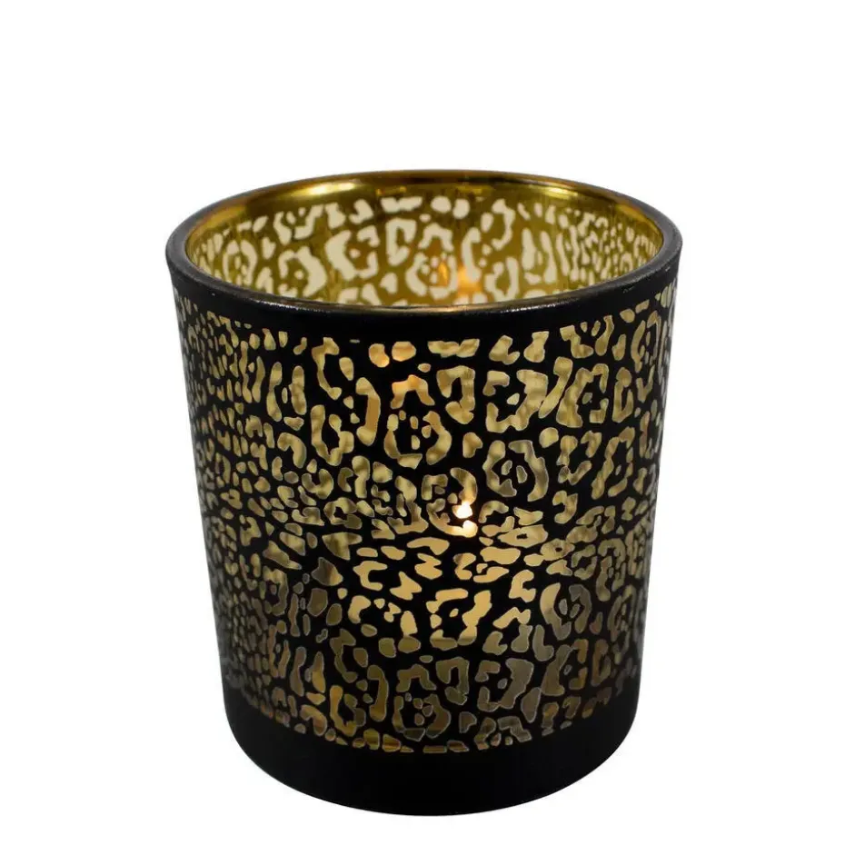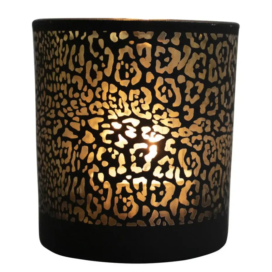 Deze stijlvolle waxinelichthouder van Mars & More is gemaakt van glas en heeft een matzwarte buitenkant met een goudkleurige binnenzijde. Het luxe ontwerp met subtiele jaguarprint zorgt voor een warme, sfeervolle gloed zodra er een kaarsje in brandt. Met een formaat van ca. 12,5 cm hoog en 10 cm in diameter is hij perfect voor waxinelichtjes of kleine kaarsen. Een echte eyecatcher voor op tafel, dressoir of in de vensterbank.