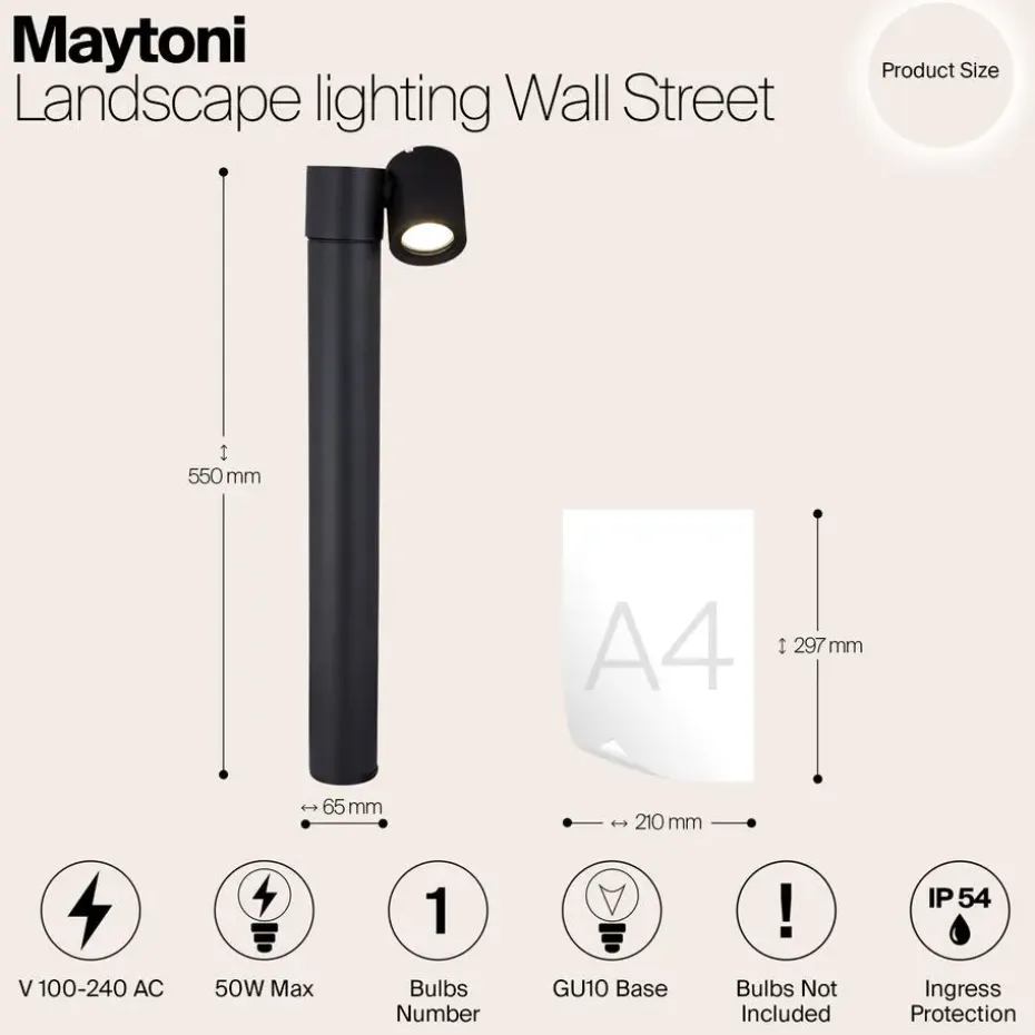 Duurzame Constructie: Gemaakt met een robuust zwart aluminium frame, zorgt deze buitenverlichting voor langdurige duurzaamheid en weerstand tegen weersinvloeden.Veelzijdige Verlichting: Vereist 1 GU10 gloeilamp (niet inbegrepen) met een maximum van 50 watt, waardoor je de gloeilamp kunt kiezen die het beste past bij jouw stijl en verlichtingsvoorkeuren.Ideale Afmetingen: Met een hoogte van 55 cm, lengte van 6,5 cm en breedte van 13,5 cm, is dit armatuur perfect voor het verlichten van tuinen, terrassen, opritten, paden, patio’s, balkons en veranda’s.Weerbestendig: Met een IP54-classificatie is deze grondlamp ontworpen om bestand te zijn tegen stof en waterspatten, waardoor hij ideaal is voor buitengebruik in verschillende weersomstandigheden.Strak Ontwerp: De moderne zwarte afwerking en het strakke ontwerp passen naadloos bij elk buiteninterieur, waardoor de esthetische aantrekkingskracht van je buitenruimtes wordt versterkt.