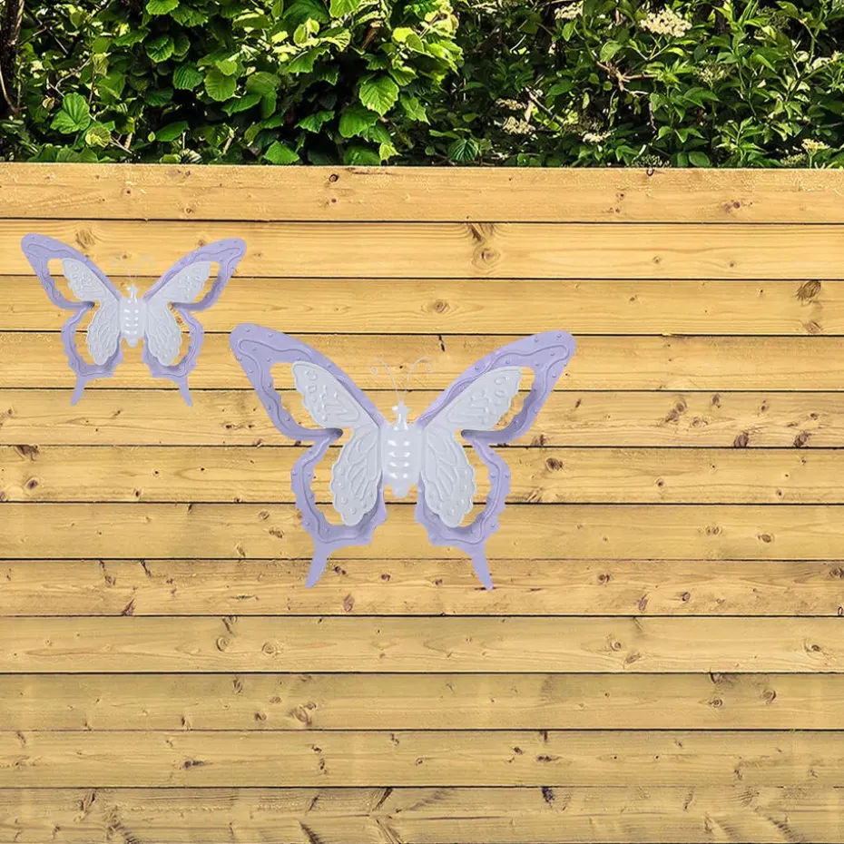 Mega Collections tuindecoratie/schuttingdecoratie vlinder voor buiten in de kleur lila paars. De muurvlinder kan eenvoudig aan de wand/muur of schutting bevestigd worden. Bevestigingsmateriaal is niet inbegrepen. Materiaal: metaal. Afmetingen: ca. 36 x 27 x 5 cm.