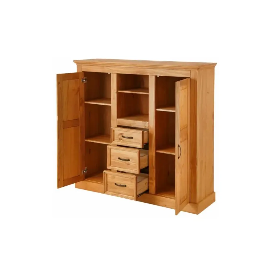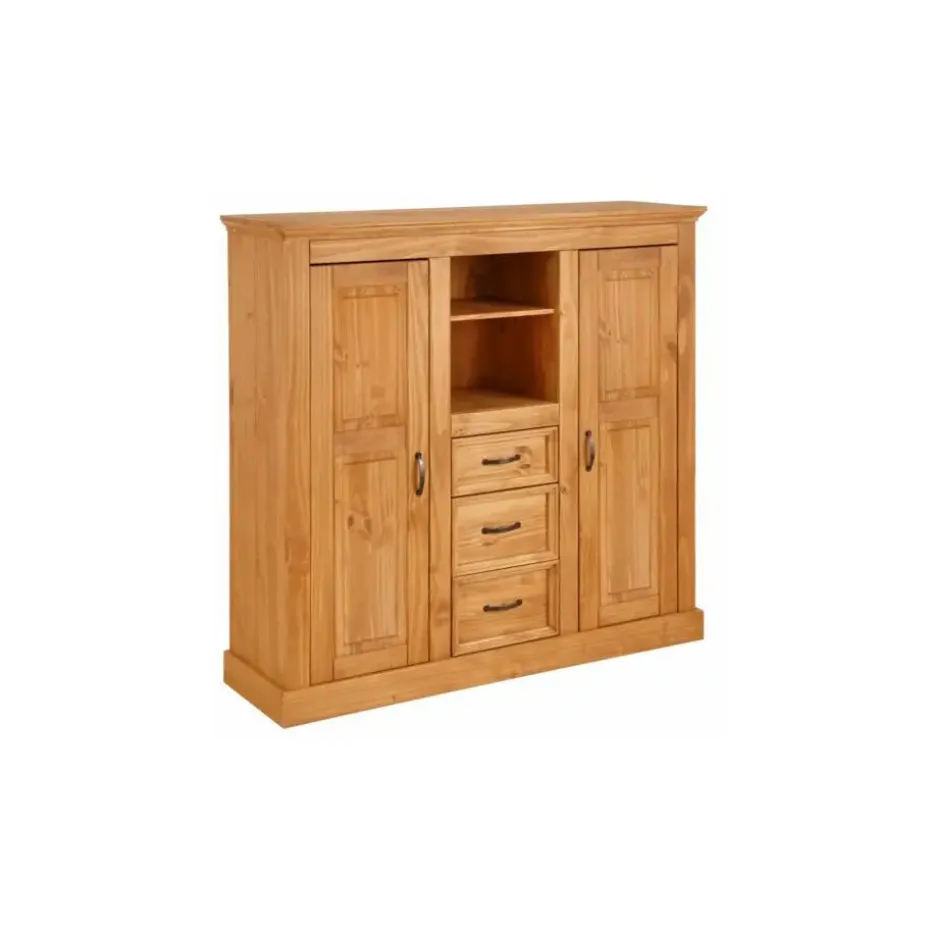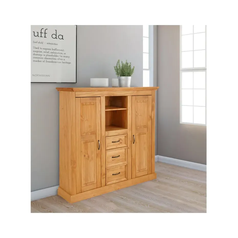 De chique hoge kast trekt snel de aandacht dankzij het aantrekkelijke ontwerp. De kast van FSC®-gecertificeerd massief hout is verkrijgbaar in verschillende kleuren met zichtbare houtstructuur en past zo bij de moderne landelijke stijl. De deuren en lades zijn voorzien van metalen handgrepen. De kast kan in de woonkamer of eetkamer worden geplaatst, maar staat ook goed in de slaapkamer. De ruimte achter de deuren is bijzonder praktisch. Meerdere houten planken bieden opbergruimte voor veel voorwerpen. De lades, die op metalen geleiders schuiven, bieden ruimte voor kleinere spullen.