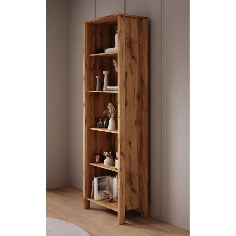 Boekenkast Isaac is uitgevoerd in een moderne, landelijke stijl, volledig in de kleur eiken. De kast beschikt over 5 open vakken. Het meubel wordt ongemonteerd geleverd. Je dient het dus met behulp van de bijgeleverde handleiding zelf in elkaar te zetten.
