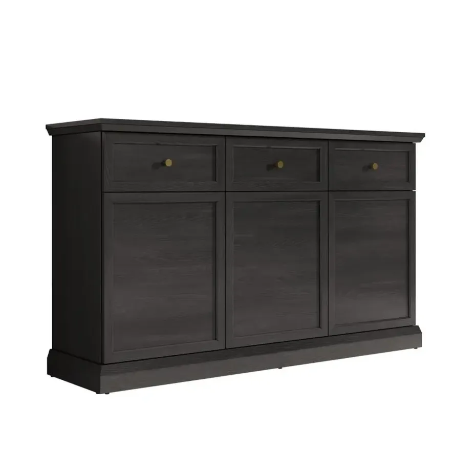 Dressoir Leroy is gemaakt in een zwart eiken kleur en heeft een landelijke uitstraling. De opbergkast beschikt over 3 deuren waarachter 6 opbergvakken zitten en 3 lades die openen met goudkleurige knoppen. Het meubel wordt ongemonteerd geleverd. Je dient het dus met behulp van de bijgeleverde handleiding zelf in elkaar te zetten.