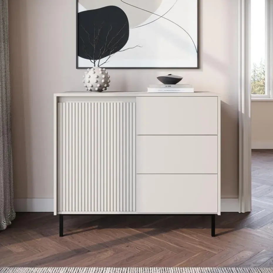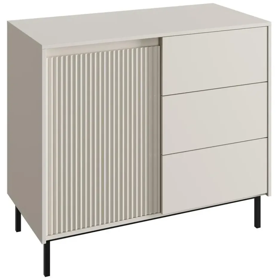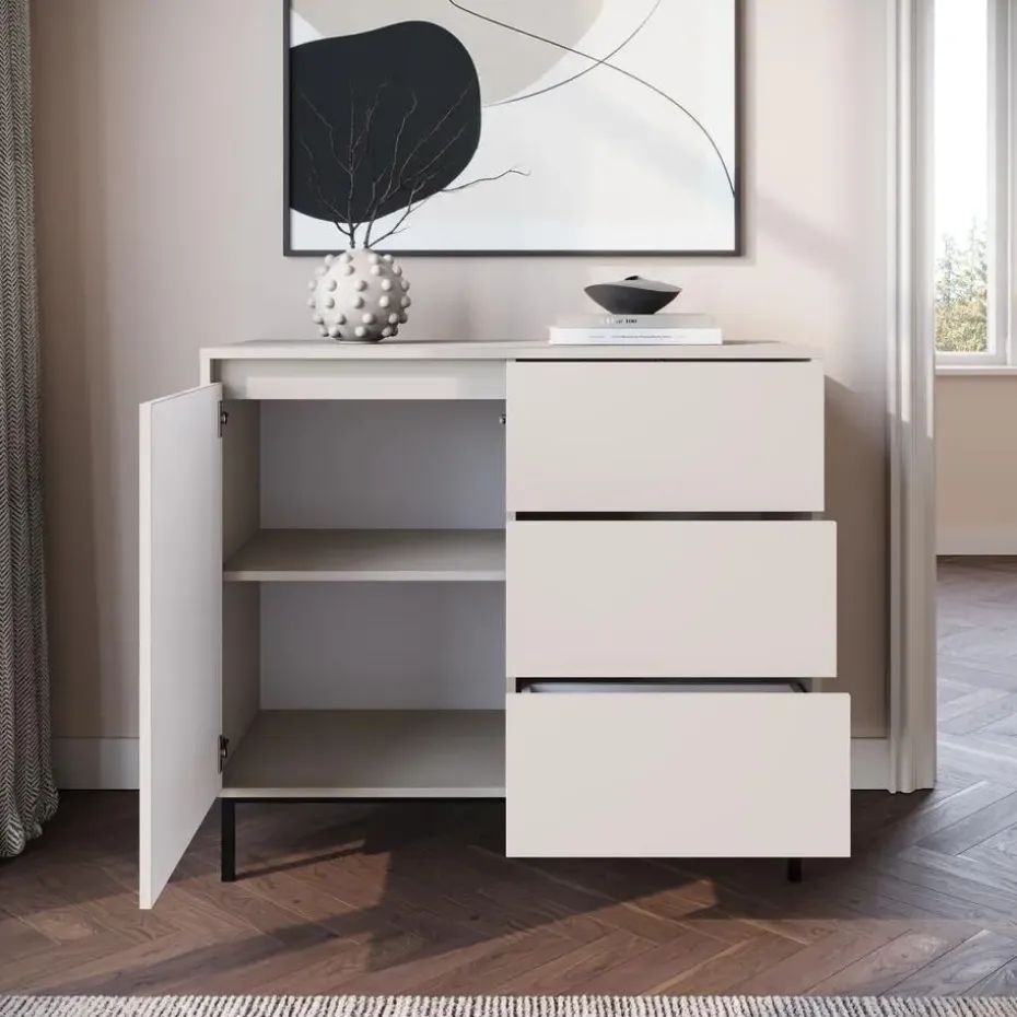 Dressoir Orvana is gemaakt in een beige kleur. De opbergkast beschikt over 1 deur en 3 lades die openen met het push to open systeem. Achter de deur zitten 2 opbergvakken. Het dressoir staat op een metalen onderstel. Het meubel wordt ongemonteerd geleverd. Je dient het dus met behulp van de bijgeleverde handleiding zelf in elkaar te zetten.