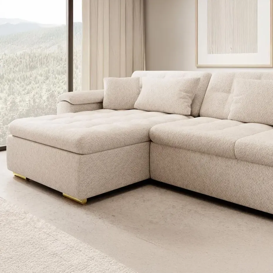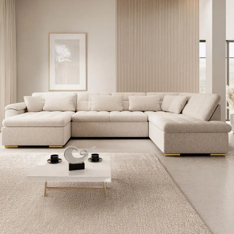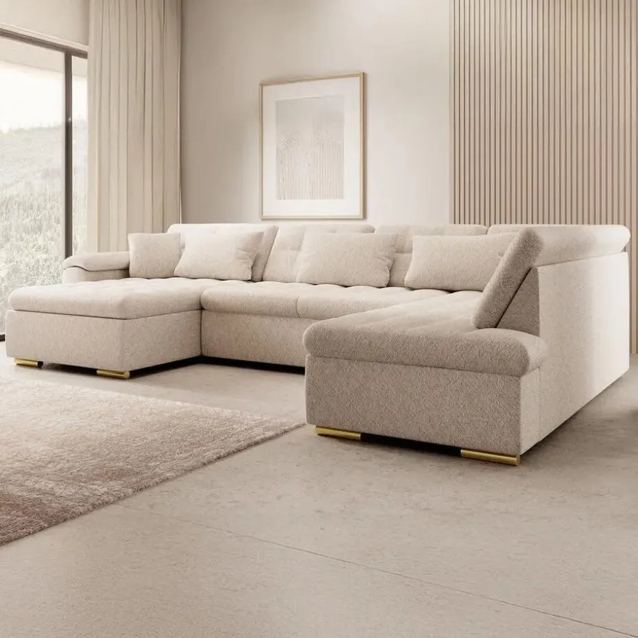 Hoekbank Nicoreta is gemaakt van teddy stof. De Nicoreta is een bank in U-vorm. Staat op lage, goudkleurige pootjes. Heeft vaste zit- en rugkussens. Inclusief bijpassende sierkussens. Het meubel wordt ongemonteerd geleverd. Je dient het dus met behulp van de bijgeleverde handleiding zelf in elkaar te zetten.