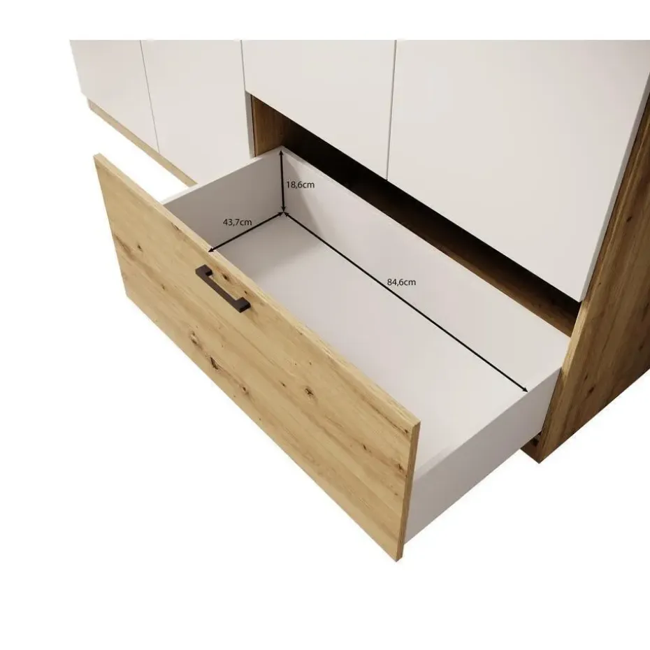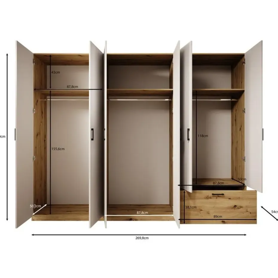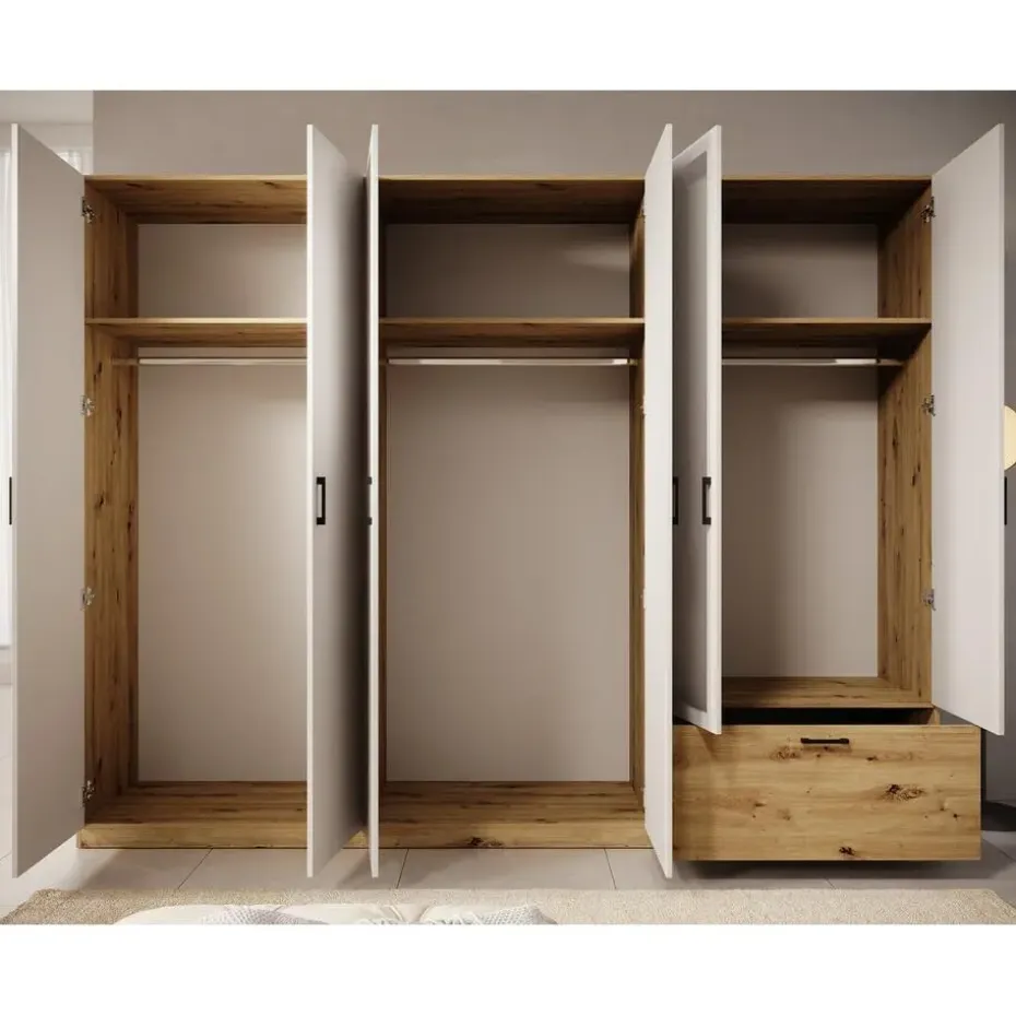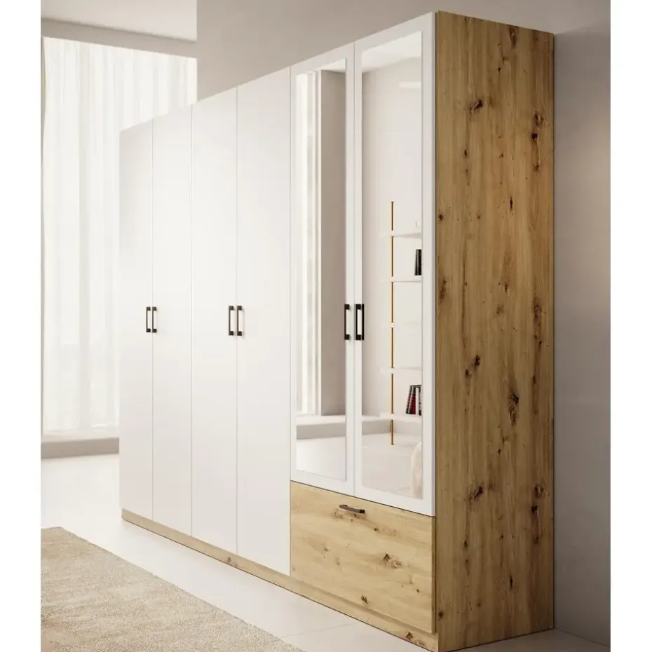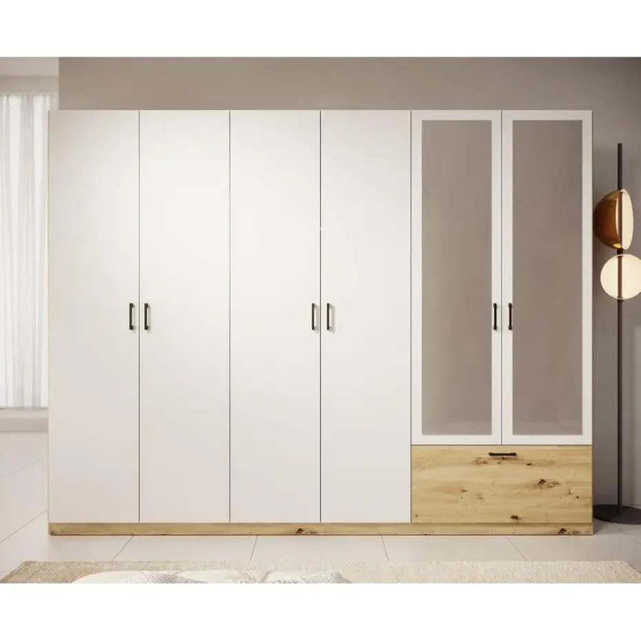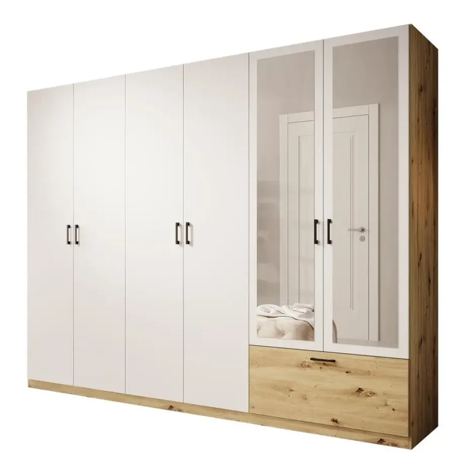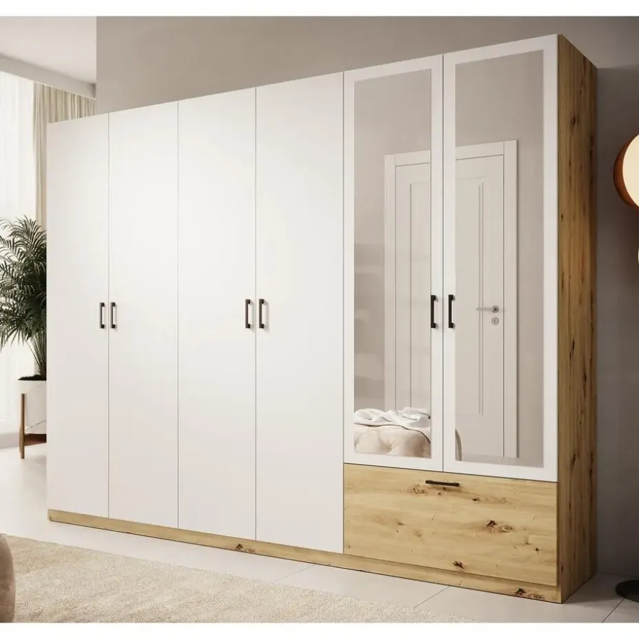 Kledingkast Audrey beschikt over 1 lade en 6 scharnierdeuren waarvan er 2 voorzien zijn van een spiegel. Deze deuren en lade openen met zwarte handgrepen. De binnenkant bestaat uit 3 opbergvakken en 3 kledingroedes. Uitgevoerd in wit met eiken kleur. Het meubel wordt ongemonteerd geleverd. Je dient het dus met behulp van de bijgeleverde handleiding zelf in elkaar te zetten.