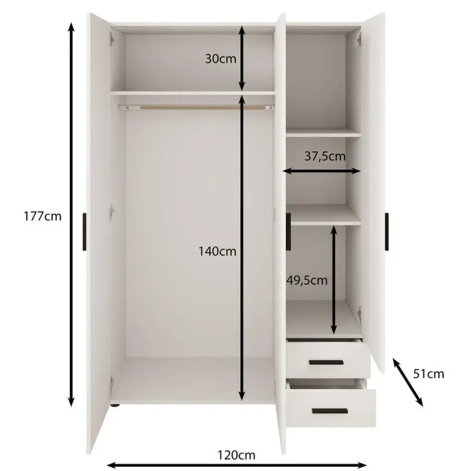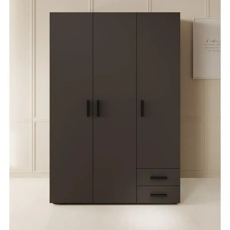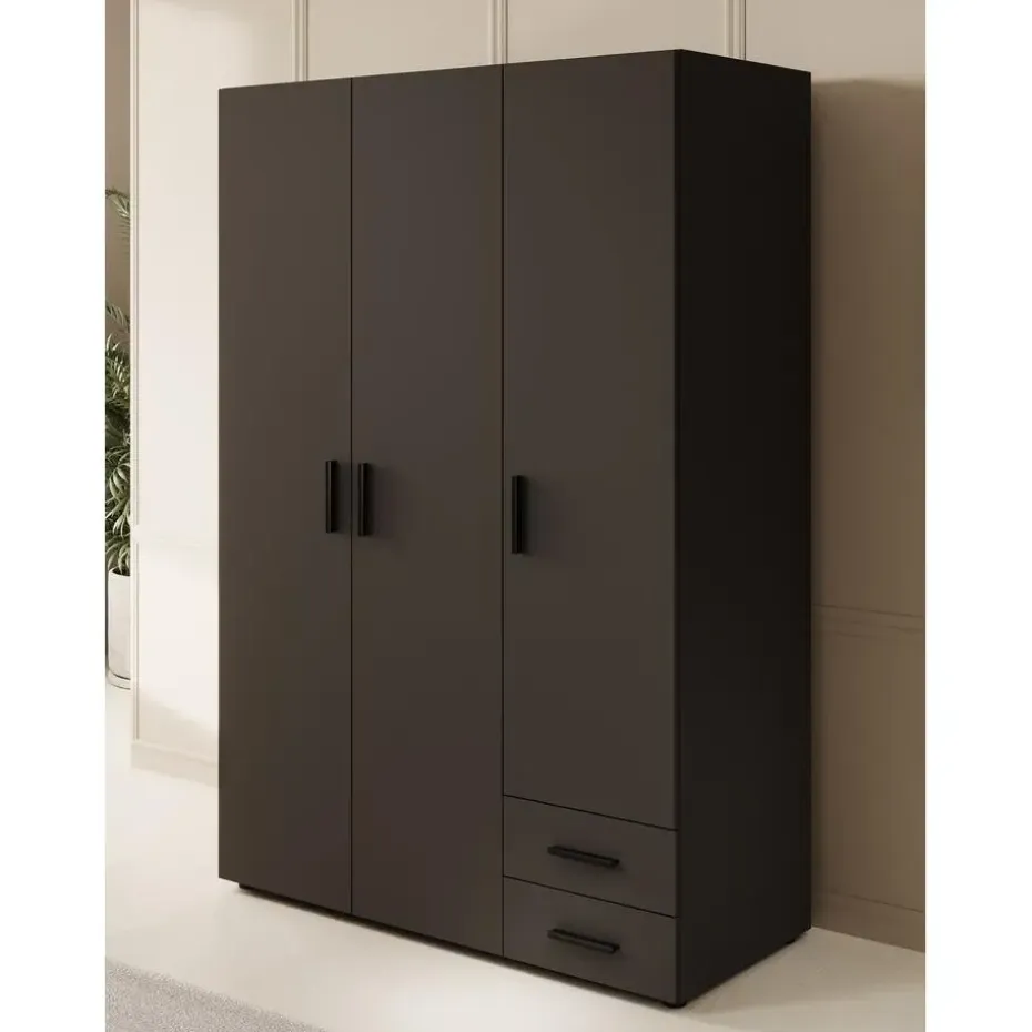 Kledingkast Bellini is voorzien van 3 scharnierdeuren en 2 lades welke openen met zwarte handgrepen. De binnenkant bestaat uit 4 opbergvakken en 1 kledingroede. De garderobekast is uitgevoerd in een moderne stijl in de kleur antraciet. Het meubel wordt ongemonteerd geleverd. Je dient het dus met behulp van de bijgeleverde handleiding zelf in elkaar te zetten.