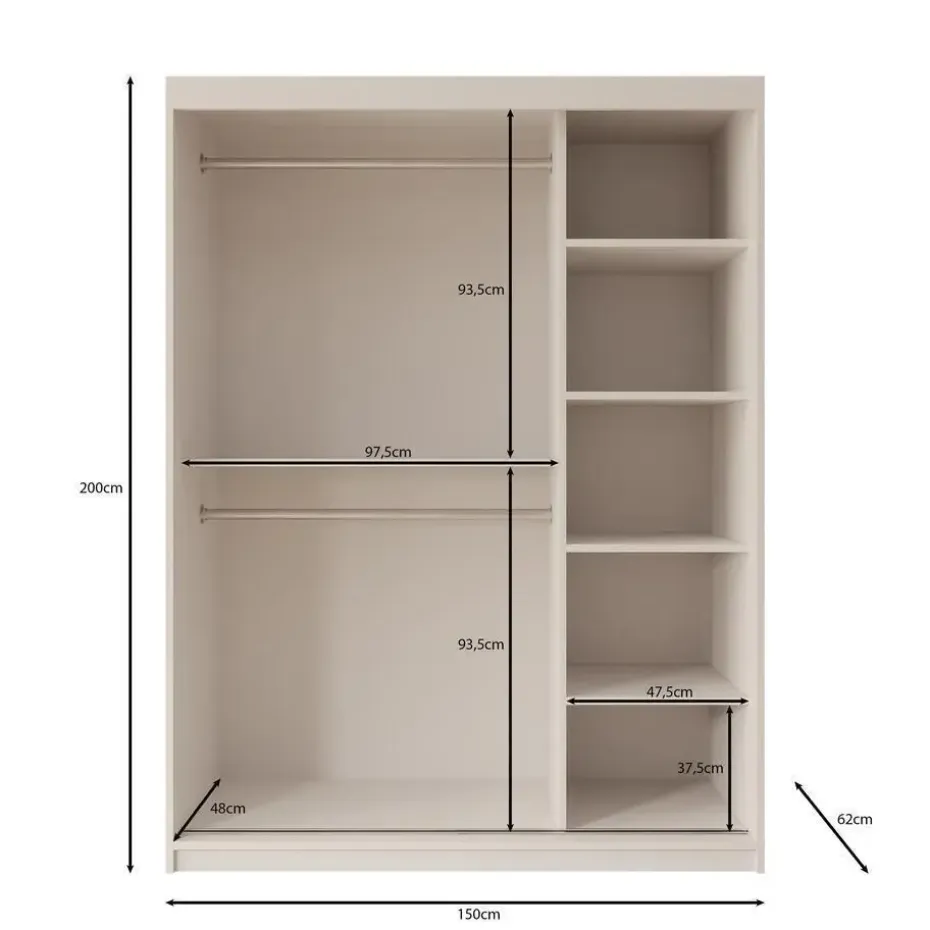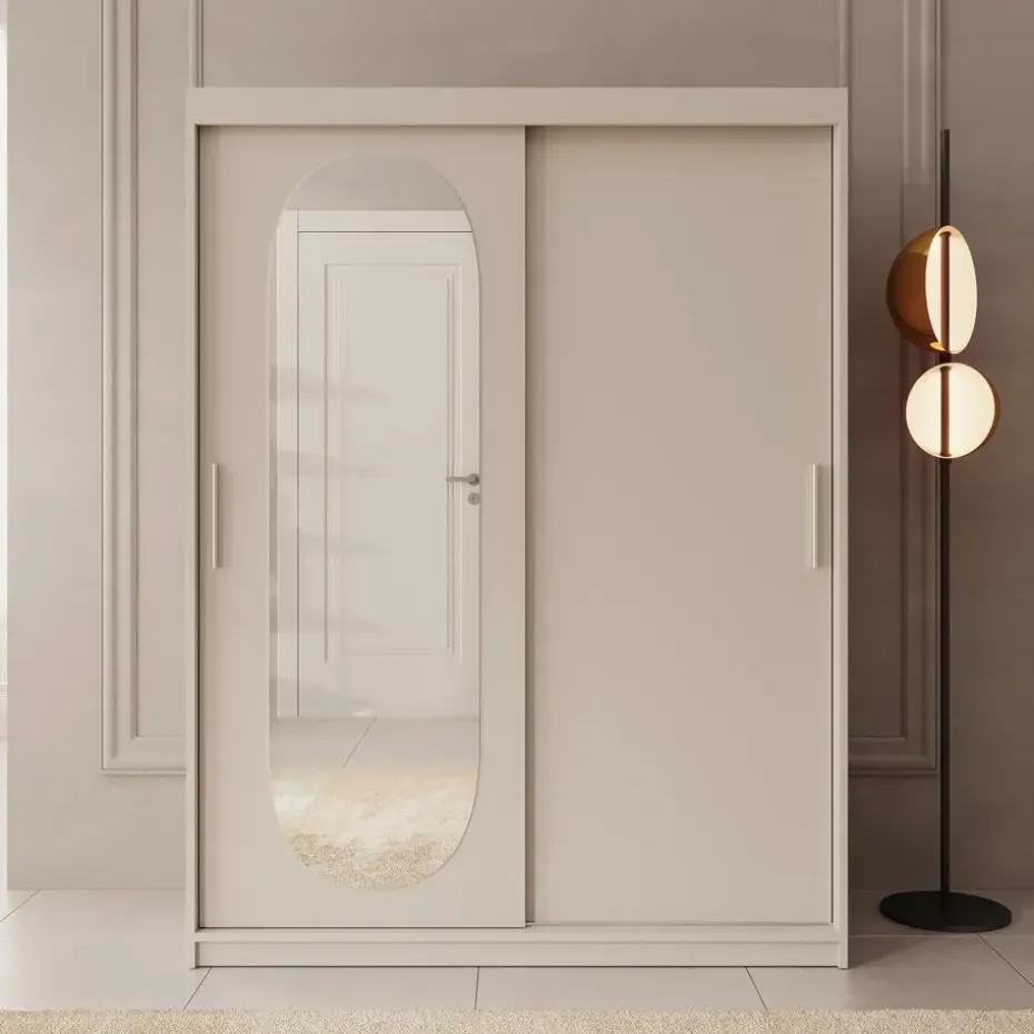 Kledingkast Bodhi beschikt over 2 schuifdeuren die openen met zilverkleurige handgrepen. De linkerdeur is voorzien van een ovale spiegel. De binnenkant bestaat uit 5 opbergvakken en 2 kledingroedes. De kast is uitgevoerd in beige kleur. Het meubel wordt ongemonteerd geleverd. Je dient het dus met behulp van de bijgeleverde handleiding zelf in elkaar te zetten.