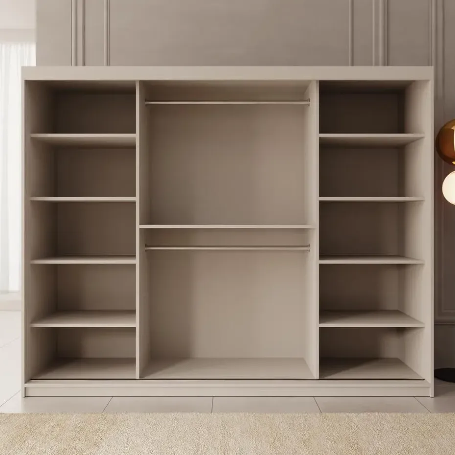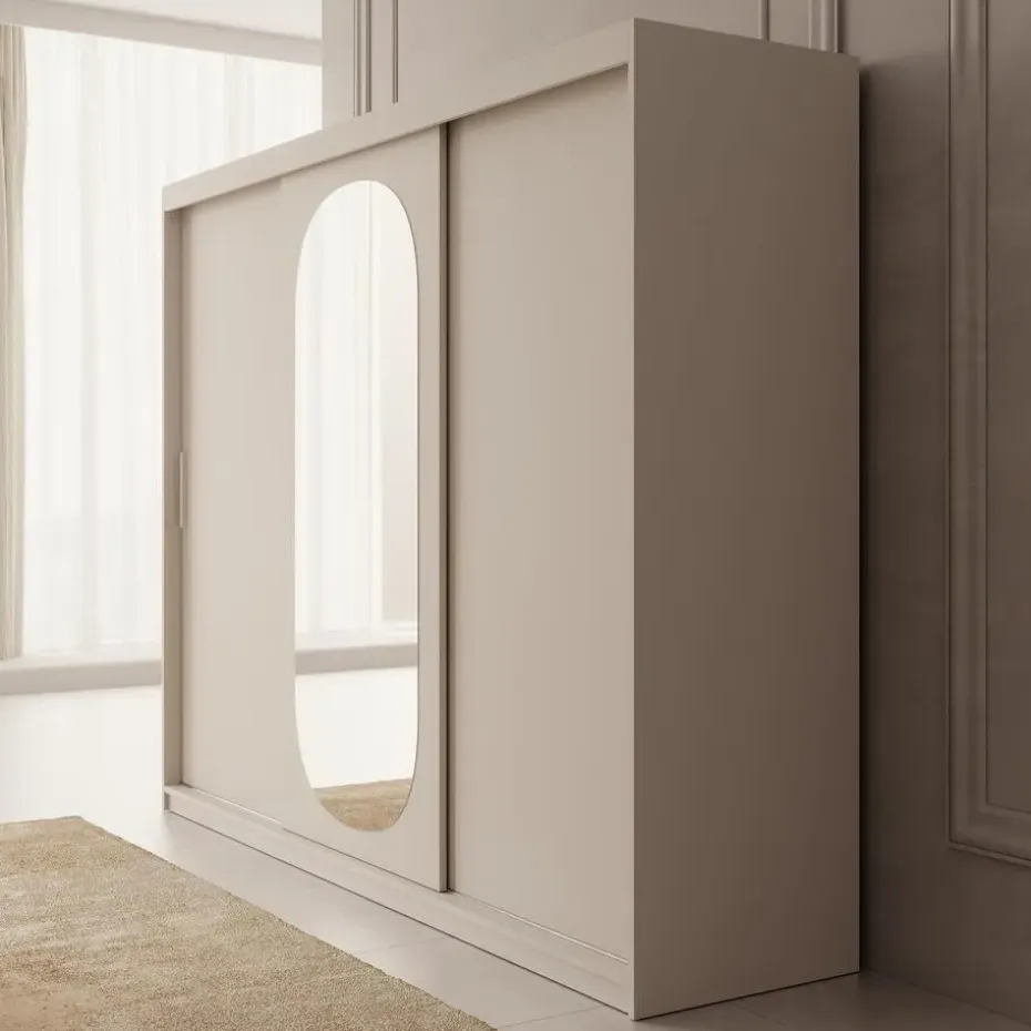 Kledingkast Bodhi beschikt over 3 schuifdeuren die openen met zilverkleurige handgrepen. De linkerdeur is voorzien van een ovale spiegel. De binnenkant bestaat uit 10 opbergvakken en 2 kledingroedes. De kast is uitgevoerd in beige kleur. Het meubel wordt ongemonteerd geleverd. Je dient het dus met behulp van de bijgeleverde handleiding zelf in elkaar te zetten.