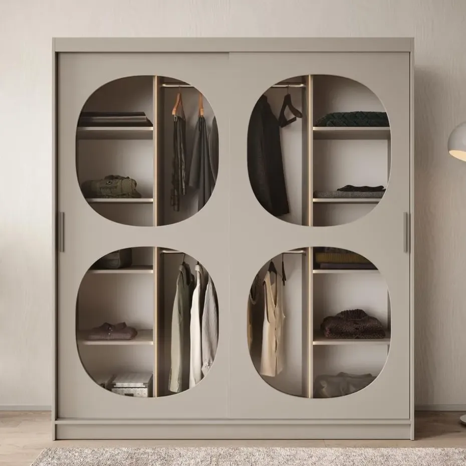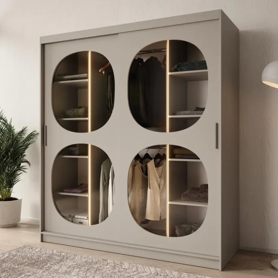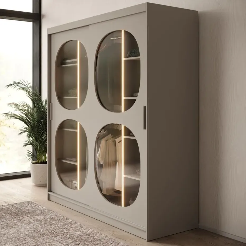 Kledingkast Bravanti beschikt over 2 schuifdeuren die openen met zilverkleurige handgrepen. Deze deuren zijn voorzien van rookglas in ronde vorm. De binnenkant bestaat uit 2 kledingroedes en 10 opbergvakken. Wordt geleverd inclusief LED-verlichting. Het meubel wordt ongemonteerd geleverd. Je dient het dus met behulp van de bijgeleverde handleiding zelf in elkaar te zetten.