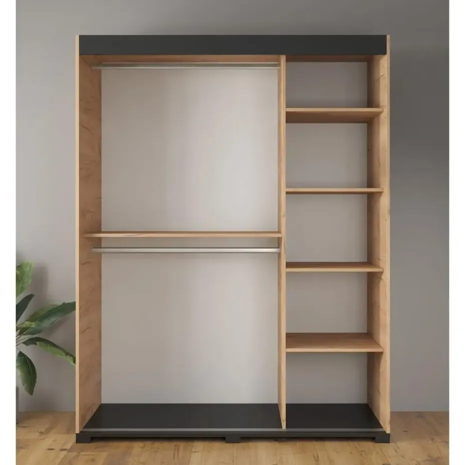 Kledingkast Fabio beschikt over 2 schuifdeuren die te openen zijn met zwarte handgrepen. De rechterdeur is voorzien van een spiegel. De binnenkant bestaat uit 2 kledingroedes om kleding aan op te hangen en 5 opbergvakken. Het meubel wordt ongemonteerd geleverd. Je dient het dus met behulp van de bijgeleverde handleiding zelf in elkaar te zetten.
