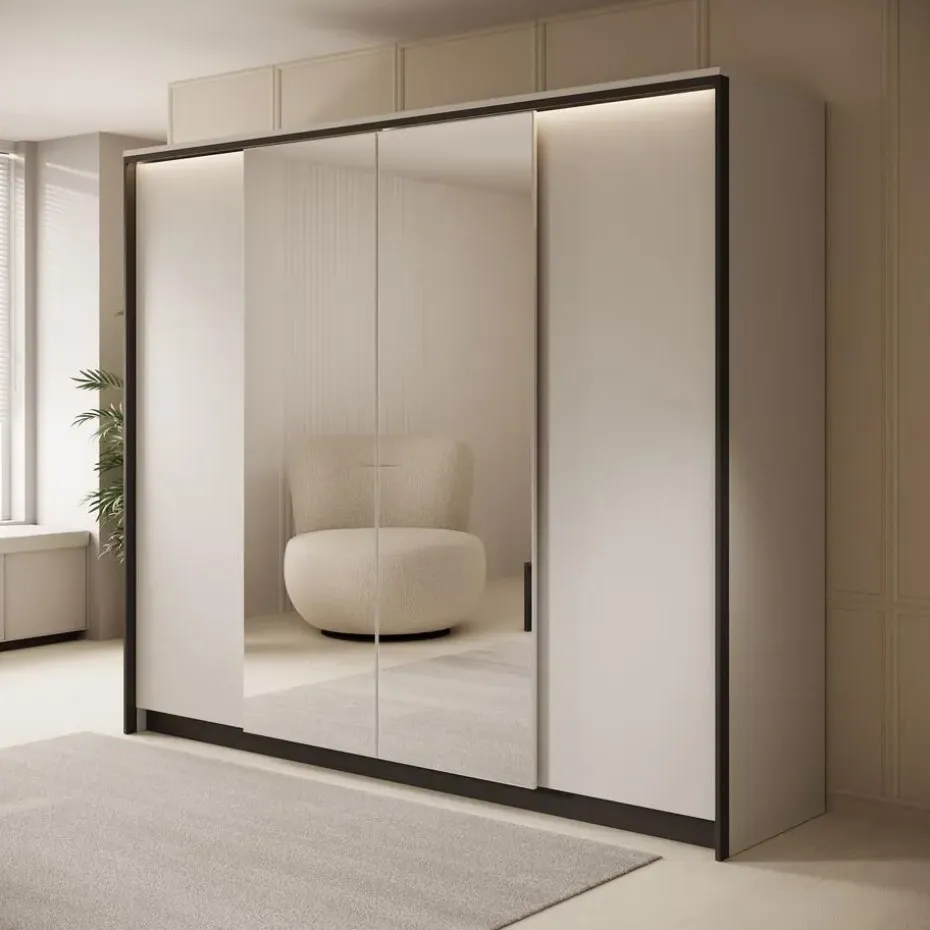 Kledingkast Genesis heeft 4 scharnierdeuren waarvan de middelste 2 voorzien zijn van spiegels. Ook beschikt deze kast over LED-verlichting. De binnenkant bestaat uit 10 opbergvakken en 2 kledingroedes. De garderobekast heeft een grijze kleur. Het meubel wordt ongemonteerd geleverd. Je dient het dus met behulp van de bijgeleverde handleiding zelf in elkaar te zetten.
