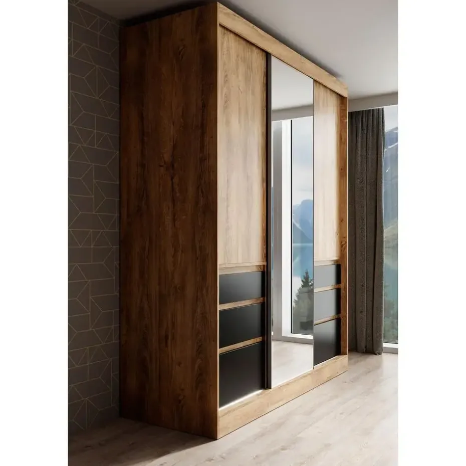 Kledingkast Henry beschikt over 3 schuifdeuren waarvan de middelste voorzien is van een spiegel. De binnenkant bestaat uit 2 kledingroedes en 5 opbergvakken. Ten slotte zijn er nog 6 lades te vinden. Het meubel wordt ongemonteerd geleverd. Je dient het dus met behulp van de bijgeleverde handleiding zelf in elkaar te zetten.