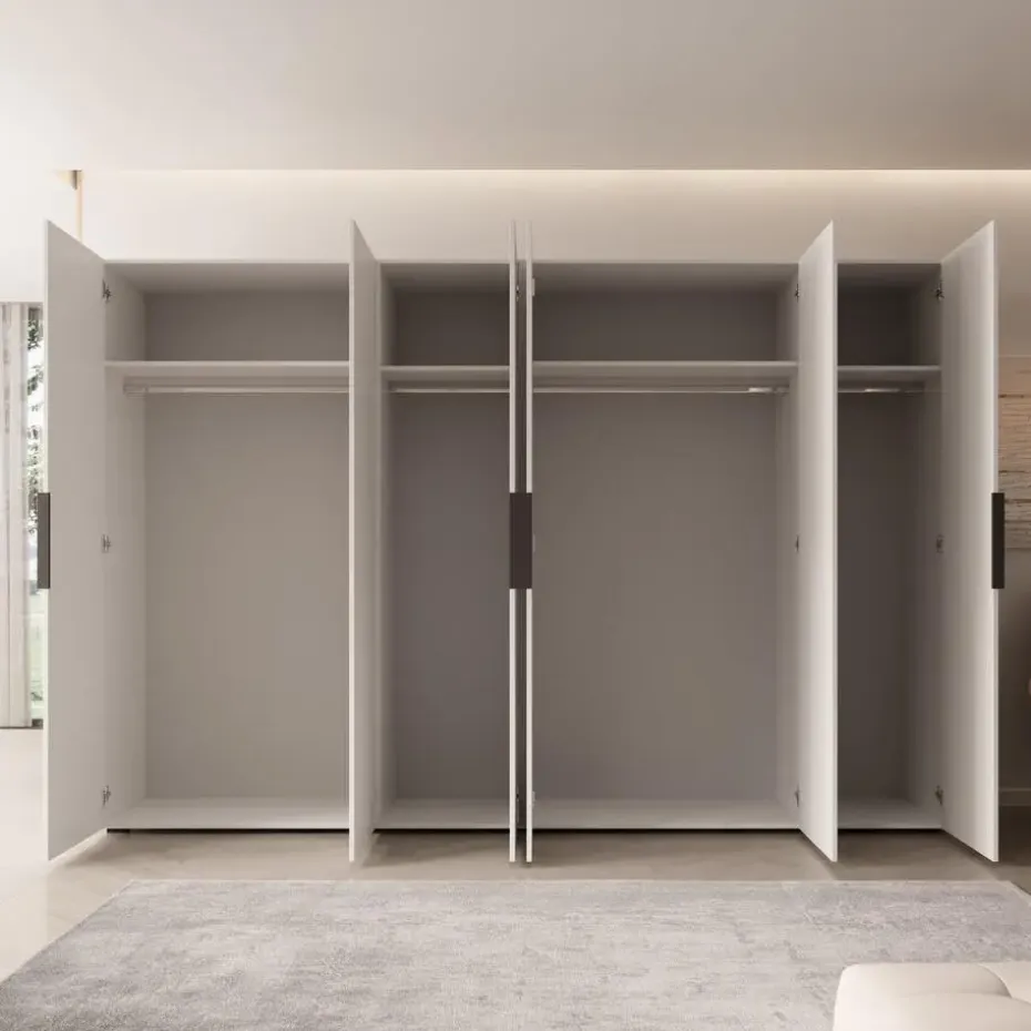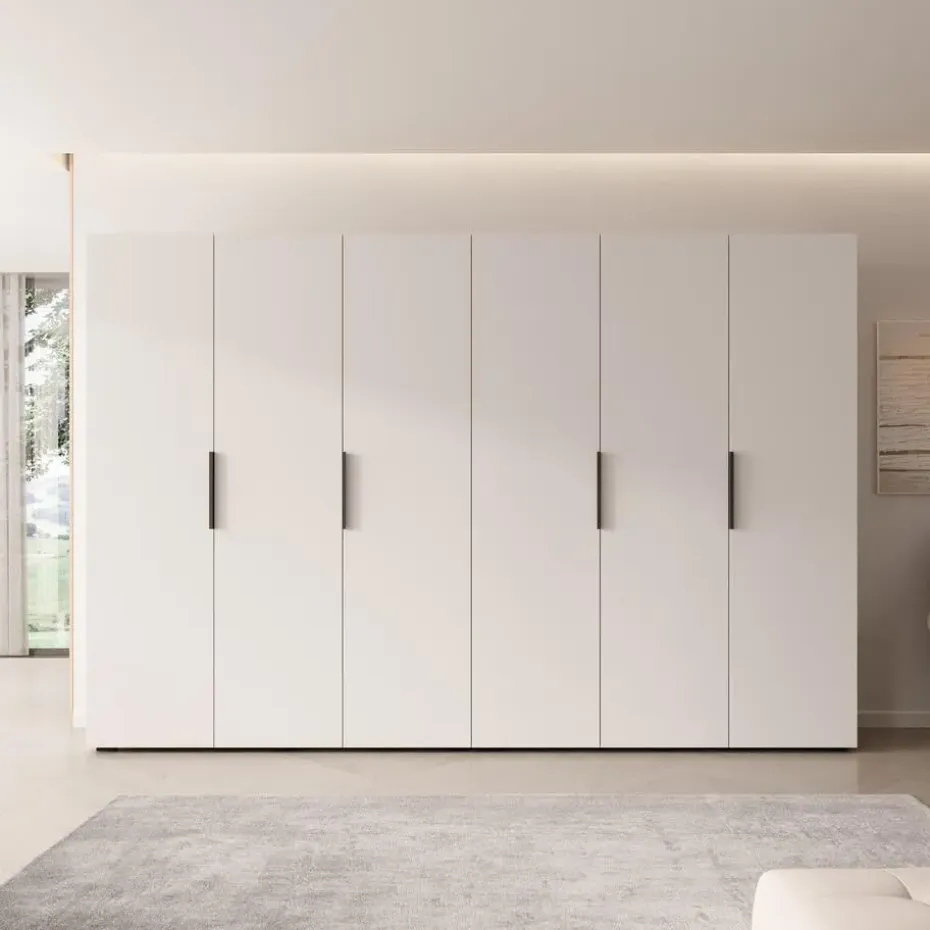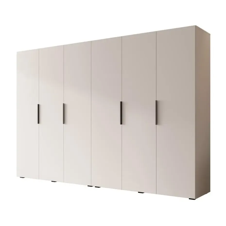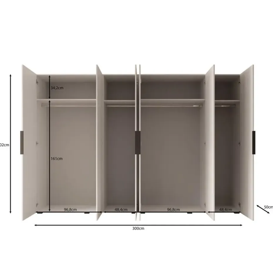 Kledingkast Marquesa beschikt over 6 scharnierdeuren die openen met zwarte handgrepen. De kast bestaat uit 2 elementen van 150 cm. De binnenkant bestaat uit 4 opbergvakken en 4 kledingroedes. De kast is uitgevoerd in de kleur wit. Het meubel wordt ongemonteerd geleverd. Je dient het dus met behulp van de bijgeleverde handleiding zelf in elkaar te zetten.