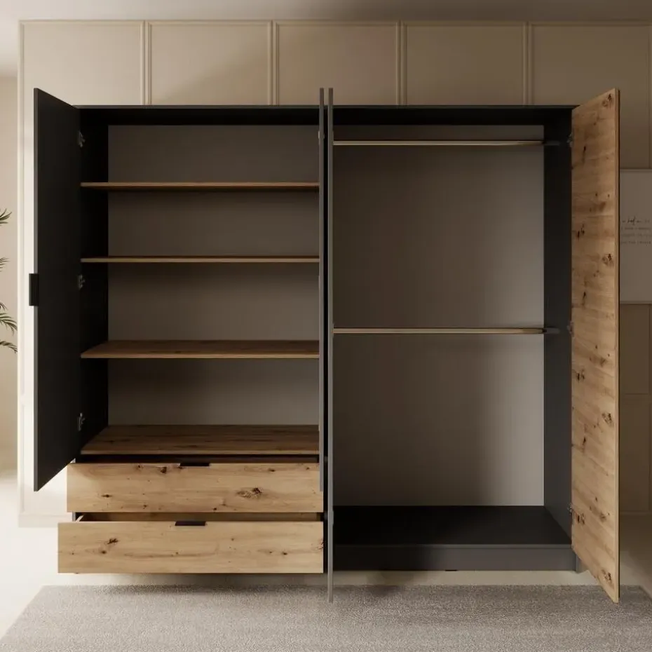 Kledingkast Roma is voorzien van 4 scharnierdeuren en 2 lades. De lades en deuren openen met zwarte handgrepen. Ook beschikt deze garderobekast over een spiegel. De binnenkant bestaat uit 4 opbergvakken en 2 kledingroedes. Het meubel wordt ongemonteerd geleverd. Je dient het dus met behulp van de bijgeleverde handleiding zelf in elkaar te zetten.