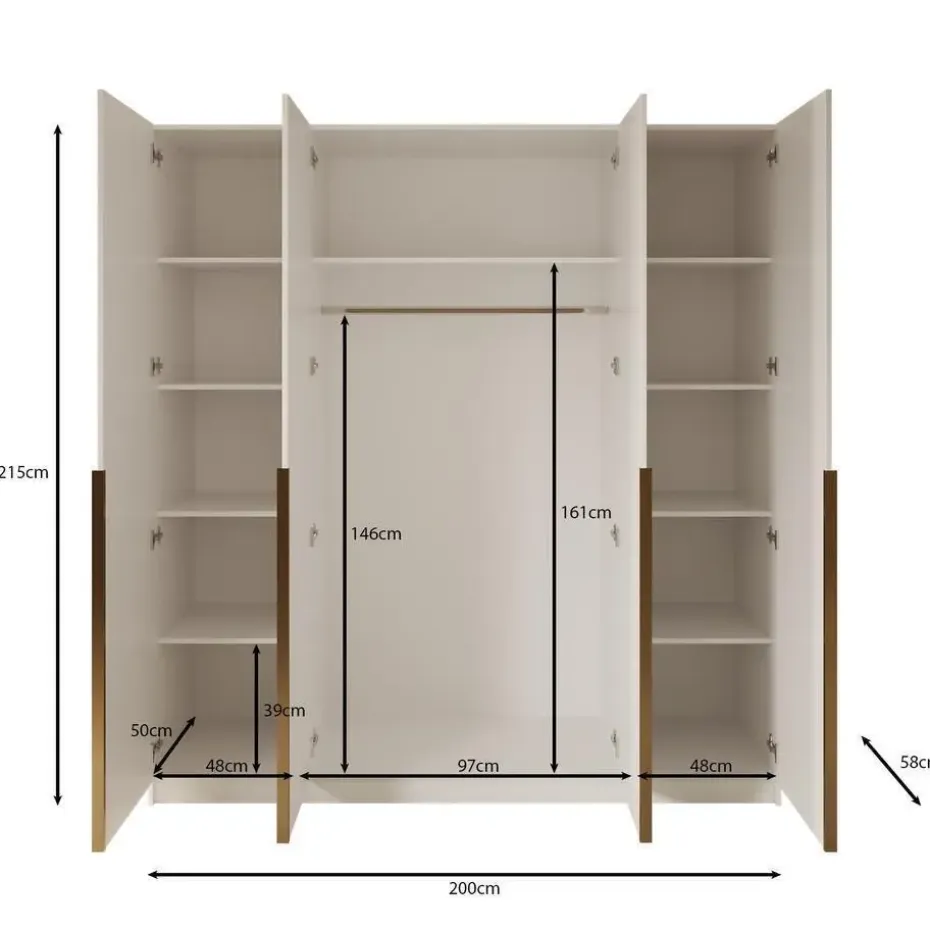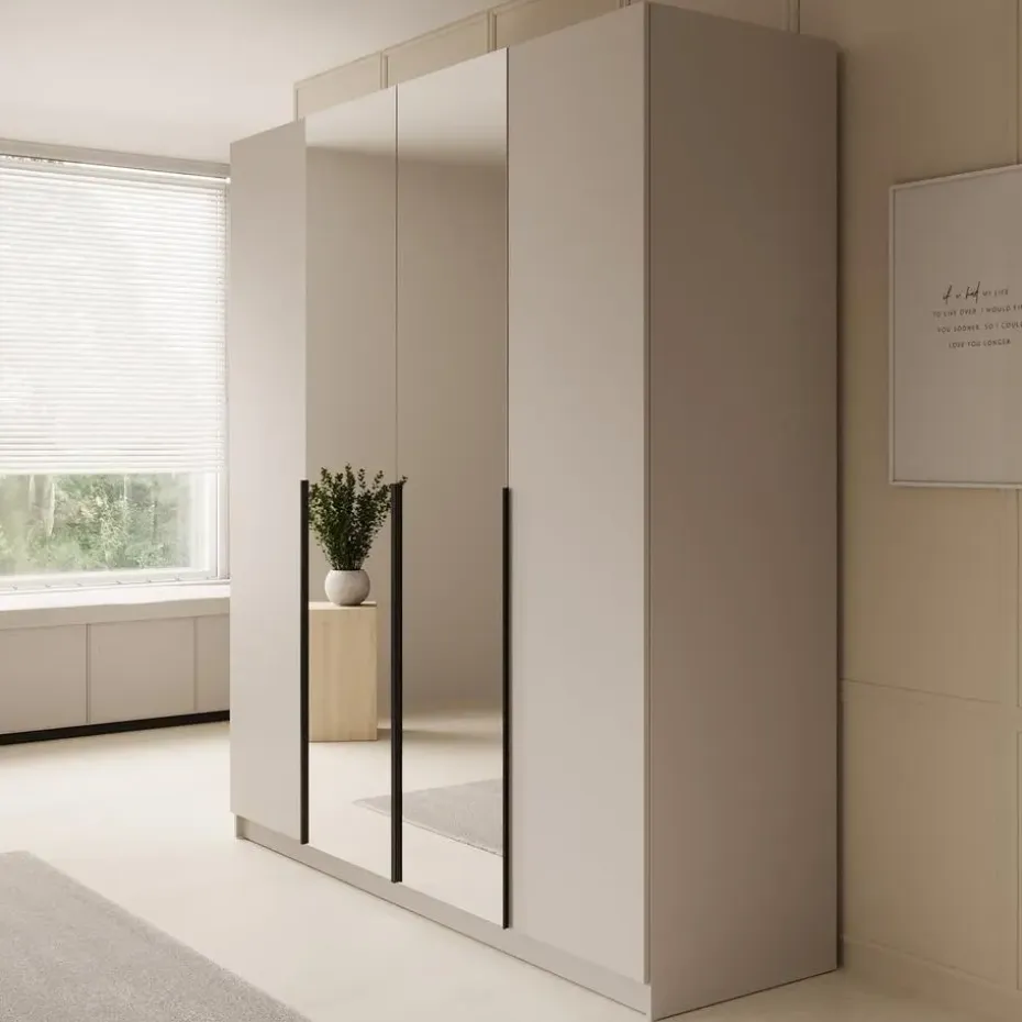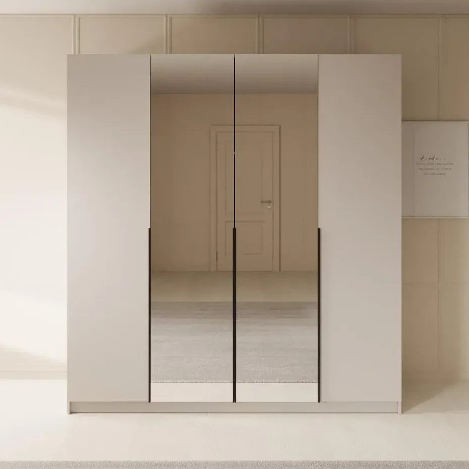 Kledingkast Sabre beschikt over 4 scharnierdeuren die openen met handgrepen. De middelste 2 deuren zijn voorzien van een spiegel. De binnenkant bestaat uit 11 opbergvakken en 1 kledingroede. De kast is uitgevoerd in beige kleur met zwarte handgrepen. Het meubel wordt ongemonteerd geleverd. Je dient het dus met behulp van de bijgeleverde handleiding zelf in elkaar te zetten.